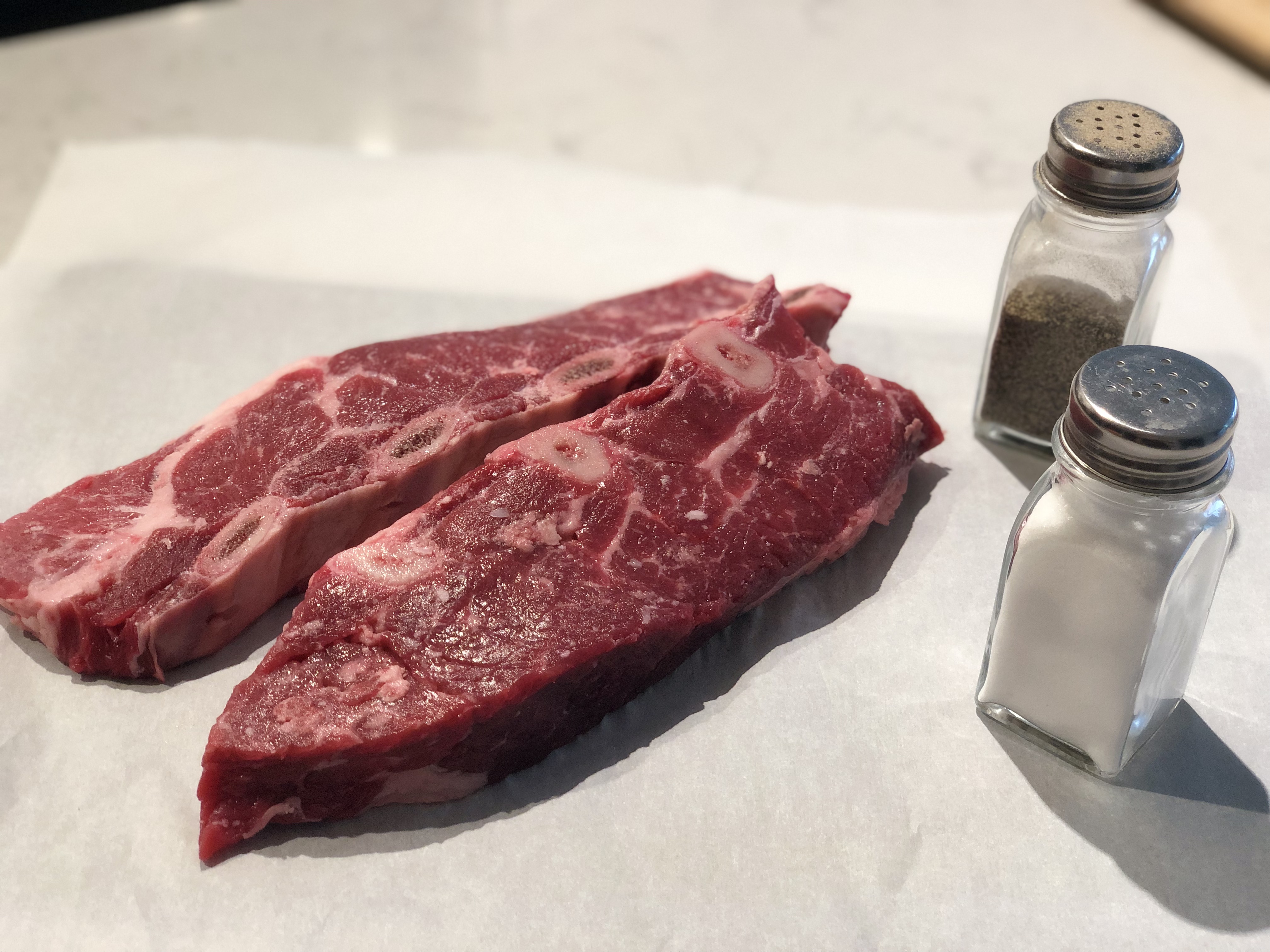 2. Season the meat generously with salt and pepper. You can do this before cutting them into portion size or after, but make sure allsides are covered with a healthy amount of S+P. Sear the meat on all sides, taking about 10 minutes total. I like to remove the short ribs after this onto a plate and remove some of the excess oil by taking some papertowel and tongs and soaking up the oil that way.