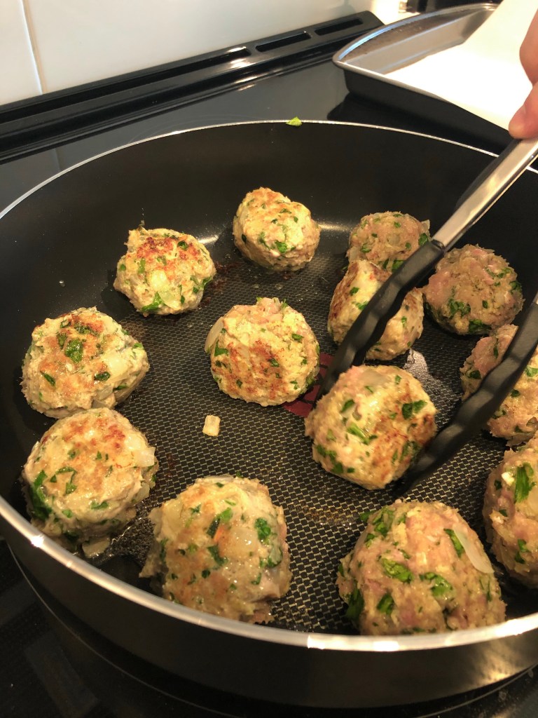 5. Next, your heated pan should be ready to start searing the meatballs. Using your hands again, create golf-ball sized meatballs and place in pan. If you hear a sizzle? Perfect.