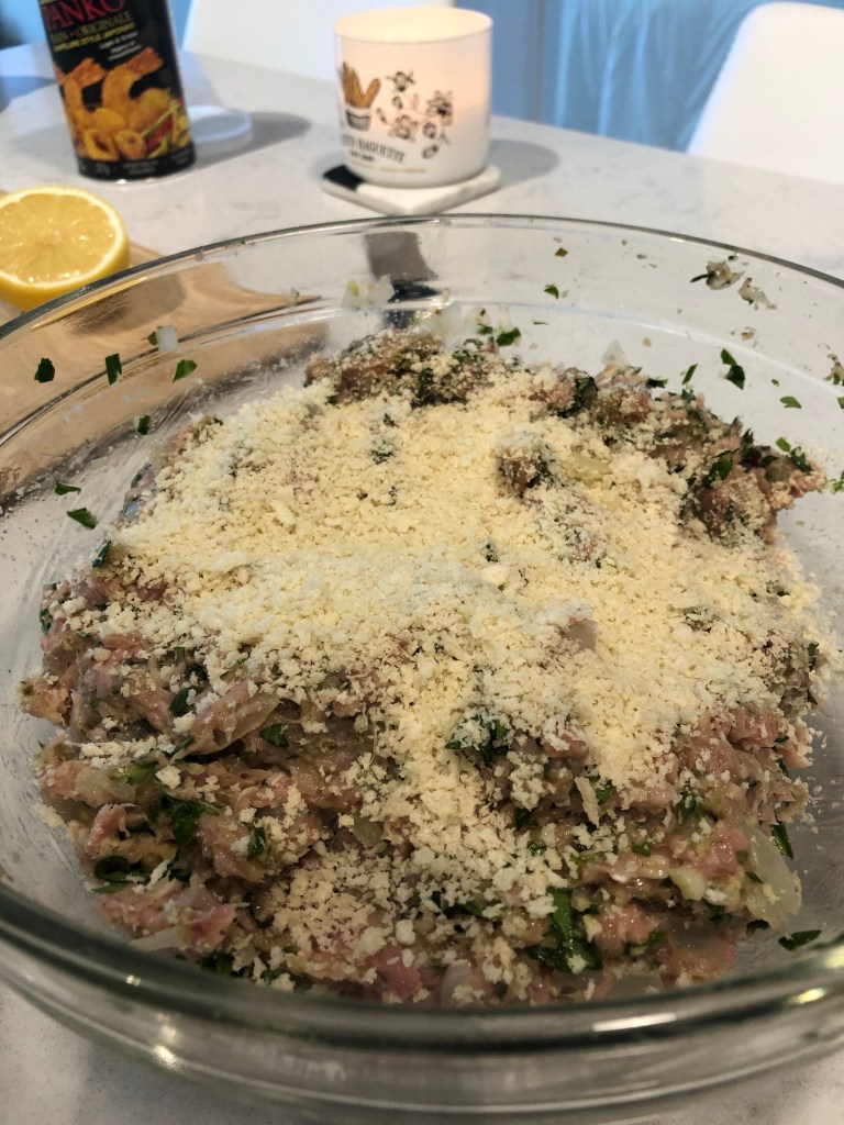4. Next is to add breadcrumbs. I don’t put a measurement in the recipe since I usually play it by touch-consistency and sight. The goal is to find the right binding consistency that will keep the meatball together so that it doesn’t crumble apart while cooking. However, too much panko can also dry out too much moisture which we don’t want since we’re using lean proteins with not much fat content.