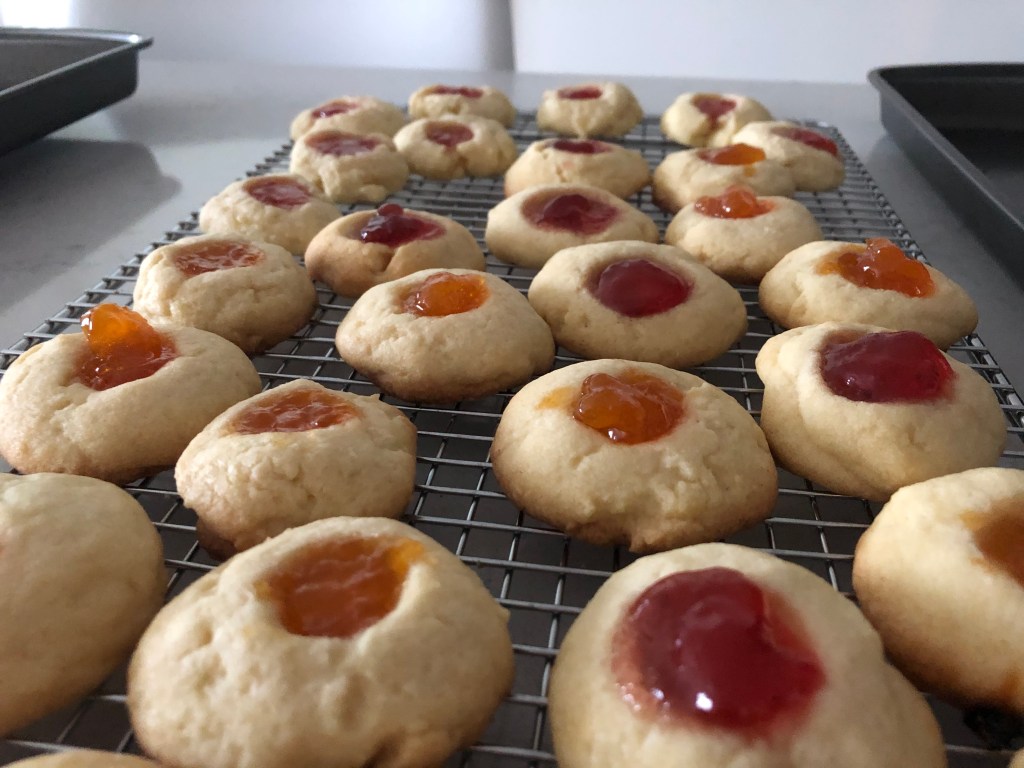 4. Not necessary, but if the jam cooked a little too far, add another small top-up of jam while the cookies are still hot. Transfer to a wire rack and allow to cool.