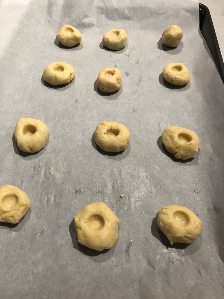 3. Using the end of a wooden spoon, press a small indentation into the ball — again dampening the spoon so it does not stick to the dough, Fill the indent with a small spoonful of jam. Bake for 18 minutes and pull when they start to turn a light golden colour.