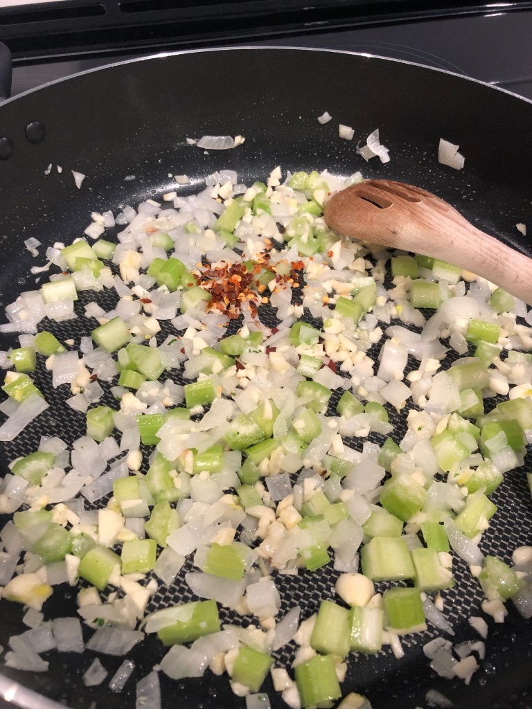 3. Add onion and celery to the pan and cook until translucent and soft. Next, add the red chilli flakes and fry with the aromatic vegetables for a minute before adding the garlic and cooking until fragrant. If you enjoy spicier food, I would add another 1/2 tsp of chilli flakes to really punch up the heat factor.