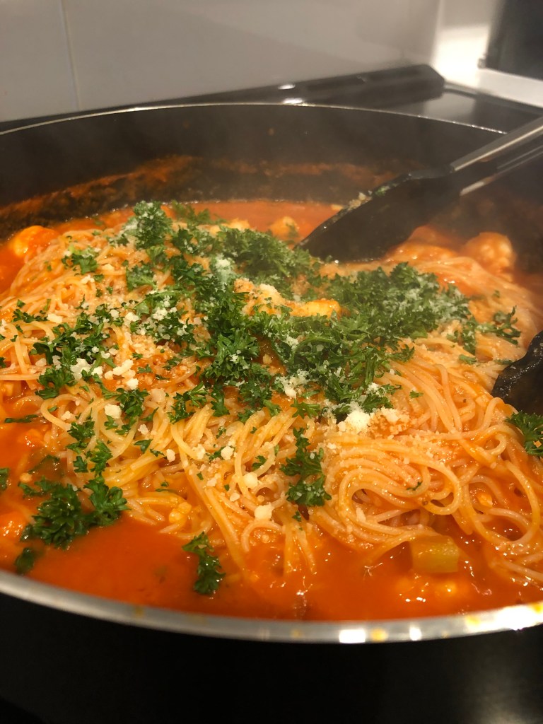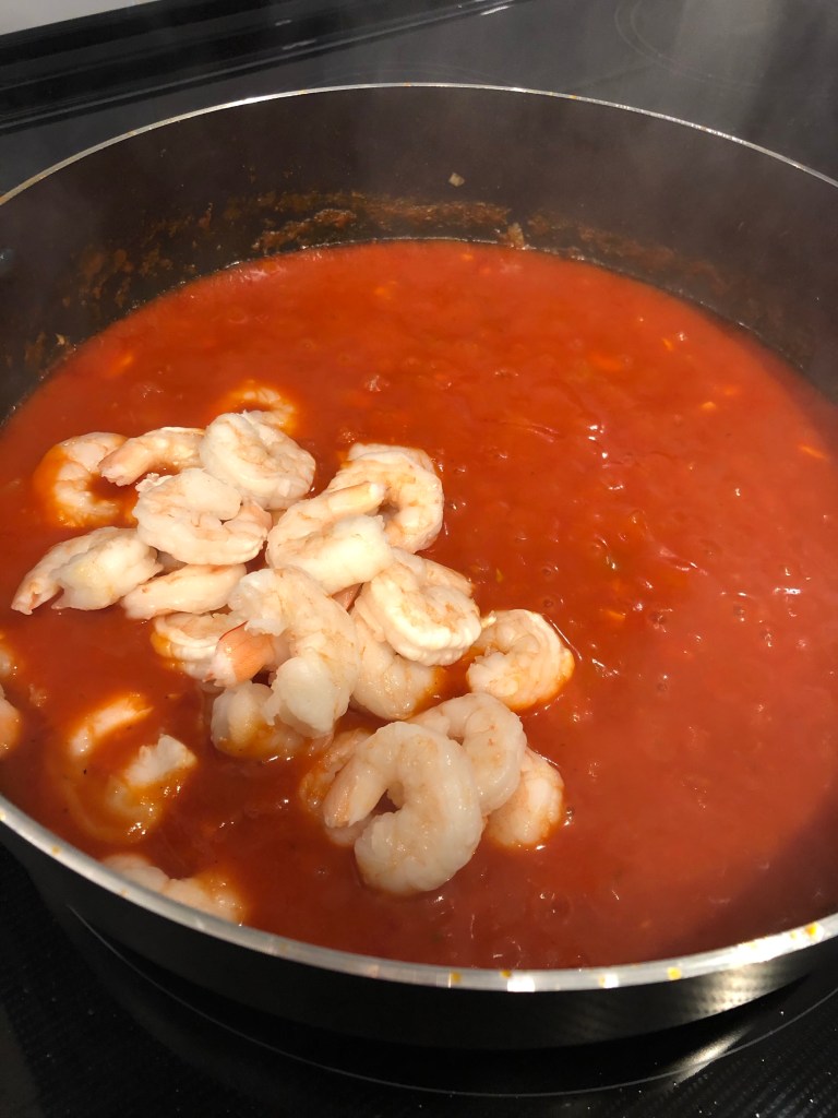 7. While checking your pasta, drop your shrimp into the tomato sauce in the last 4-5 minutes to allow them to be heated through gently. You’re avoiding them becoming extremely overcooked and chewy by doing this.