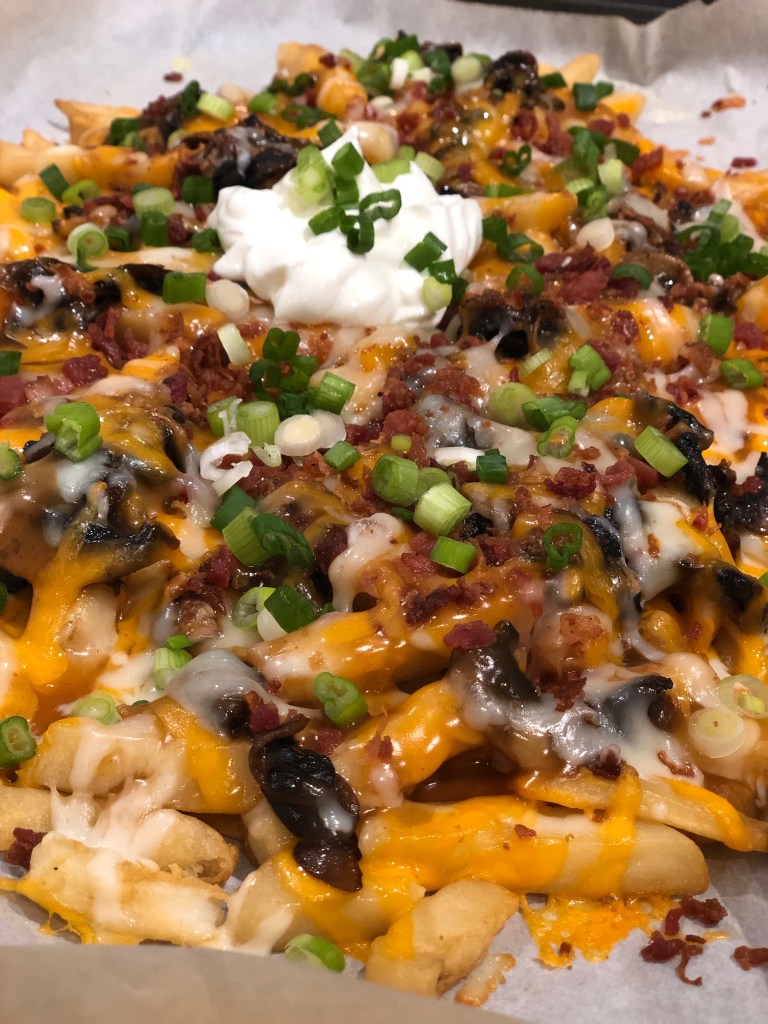 1.Preheat oven according to french fry instructions. In the meantime, cut up your mushrooms, green onions, and shred your cheese for assembly. Lay the fries over parchment paper on a baking sheet and cook according to package.