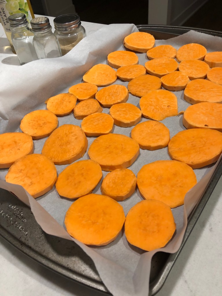 2. Lay out the cut sweet potato rounds onto a baking sheet lined with parchment paper.