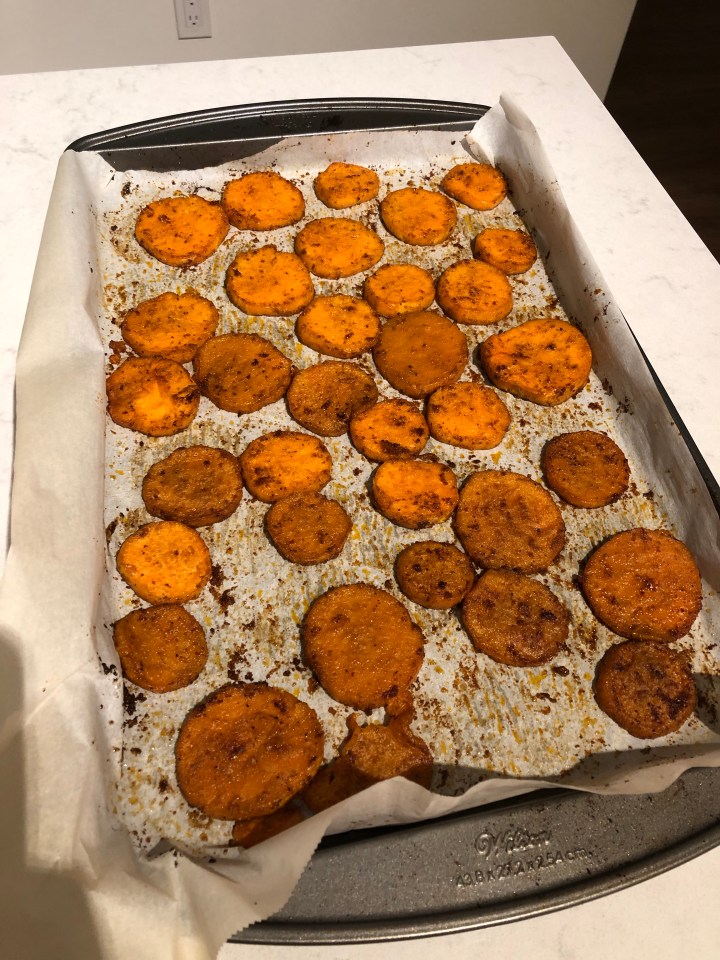 - 2 large sweet potatoes, peeled and cut into 1/4 coins