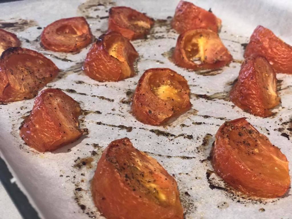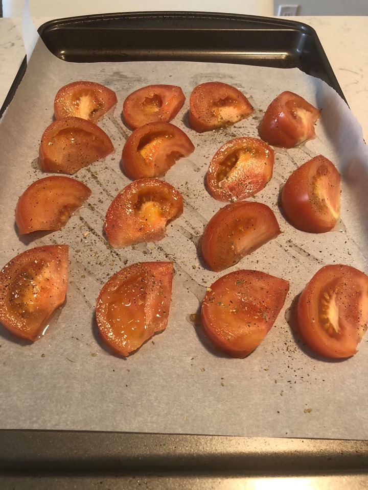 1. Start by preheating the oven to 400°F and lining two sheet tray with parchment paper. Place the chunky slices of tomato in rows and drizzle with olive oil, salt, pepper, and a sprinkle of dried oregano. Bake the tomatoes for 45 minutes until the edges are brown and roasted, no need to flip while they cook.
