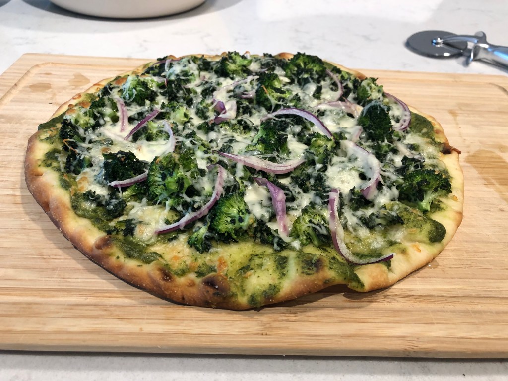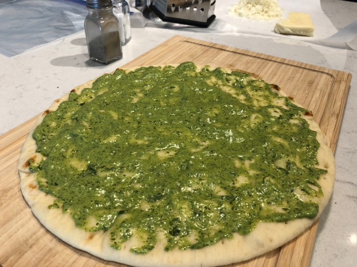 I ended up using a basil pesto to act as the red sauce base — game changer when it comes pizza, and a super great way to use up a bunch of basil when you’re worried that it’s getting bruised and brown faster than you’d like. It provides a fragrant and herbaceous lift to an otherwise heavier meal, AND a homemade, vibrant pesto just hits different in comparison to the jarred stuff. I highly recommend trying to make your own pesto whenever you can! It will 1) look so much greener and healthier for you lol, and 2) taste fresh and not preserved