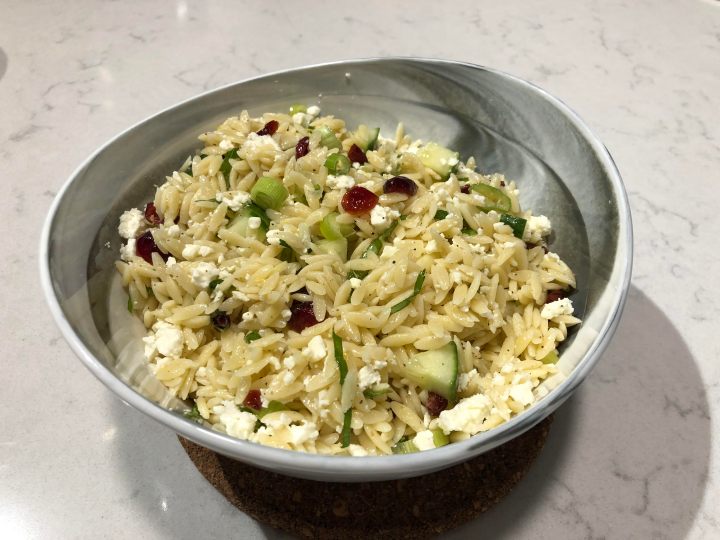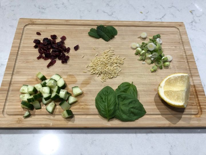 This pasta salad is a little different from your ordinary bow-tie pasta comfort level — today we’re using orzo! Orzo is a small pasta that resembles the look and feel of rice. It’s great as a lighter option for lunch since it doesn’t really feel like you’re eating a whole bowl of pasta, and it takes much less time to cook through since it is relatively smaller.