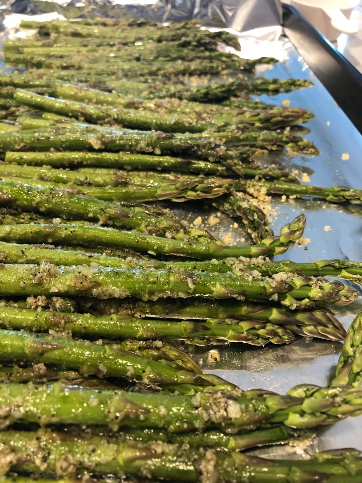 Preheat your oven to 400°F. Prepare your asparagus by cutting off the woody bottom third of the spear and discard. Lay them on a baking tray lined with parchment or aluminum foil and spread them out so they are all laying flat.