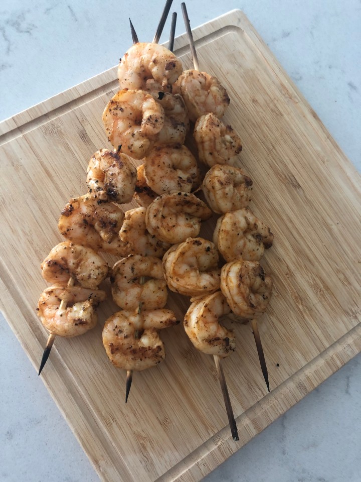 Next, slide 6 – 7 shrimp on each skewer and grill them about 1.5 – 2 minutes per side on high heat.