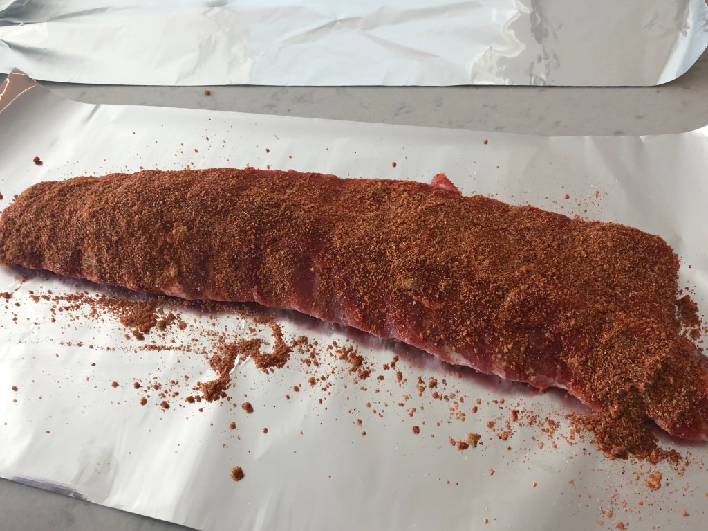 Next, coat the ribs liberally with the dry rub on both sides and pat it into the meat.