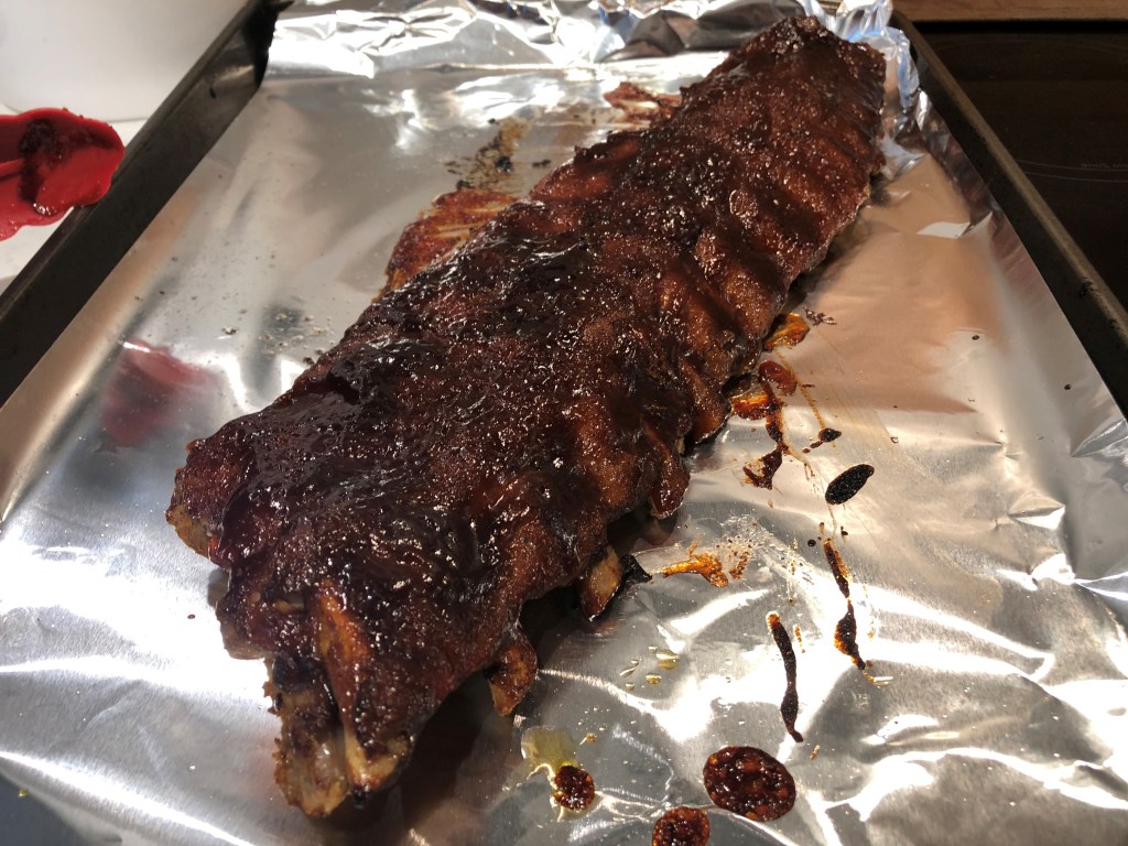 Lastly, in order to get that sticky, messy rib that we all crave — slather the bbq sauce over top of the ribs and set your oven to broil.