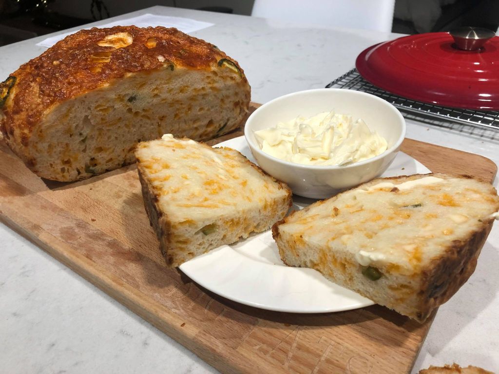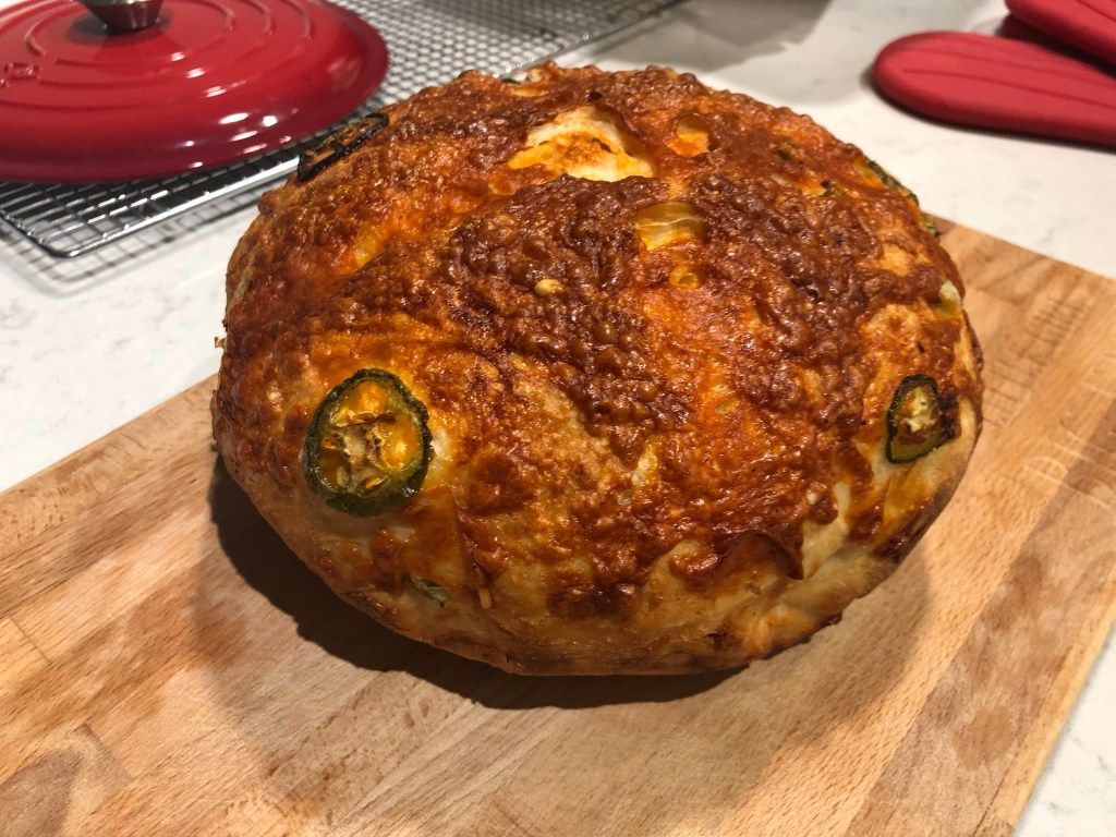 Remember the dutch oven no-knead bread experience that I posted a while ago? Well we’re spicing it up by adding savoury cheddar cheese and fresh jalapeños — queue the drool. So go get your dutch oven folks and let’s get ready to rumble.