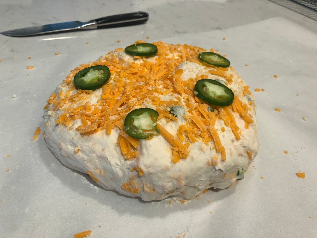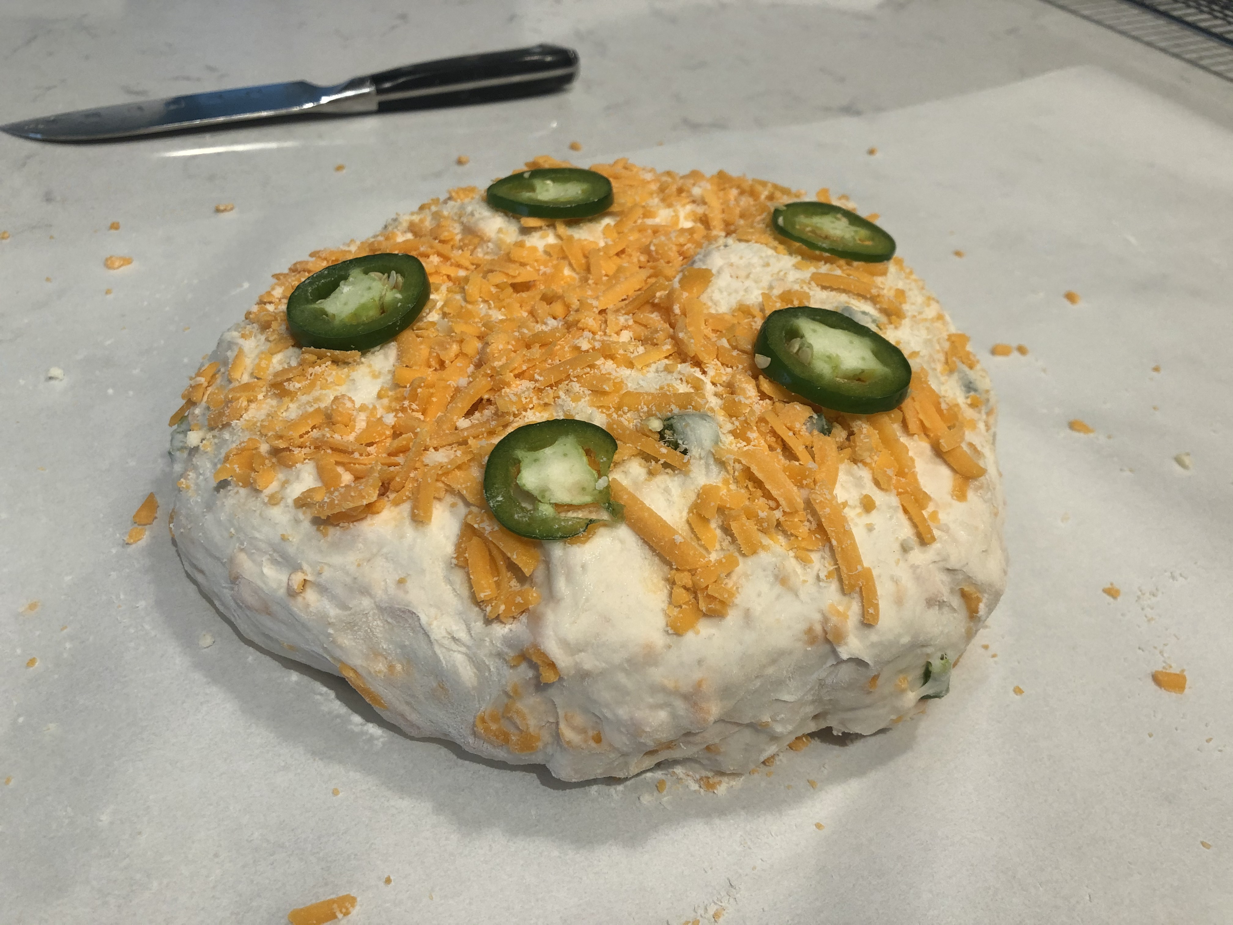 7. Take a sharp knife and score the top (an X works). Spray with cooking oil or lightly oil the surface of the dough before sprinkling the remaining half cup of cheese over top of the dough, as well as the sliced rounds of jalapeño.