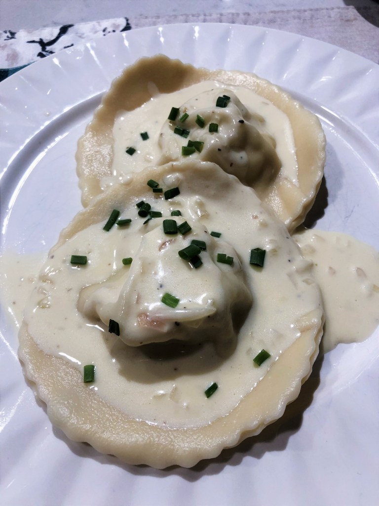 7. Boil the pasta for up to 10 minutes in salted water (fresh pasta normally cooks faster, but because we have a double-layered pasta, it will take slightly longer to cook the ravioli). Garnish with chives and the cream sauce and serve immediately.
