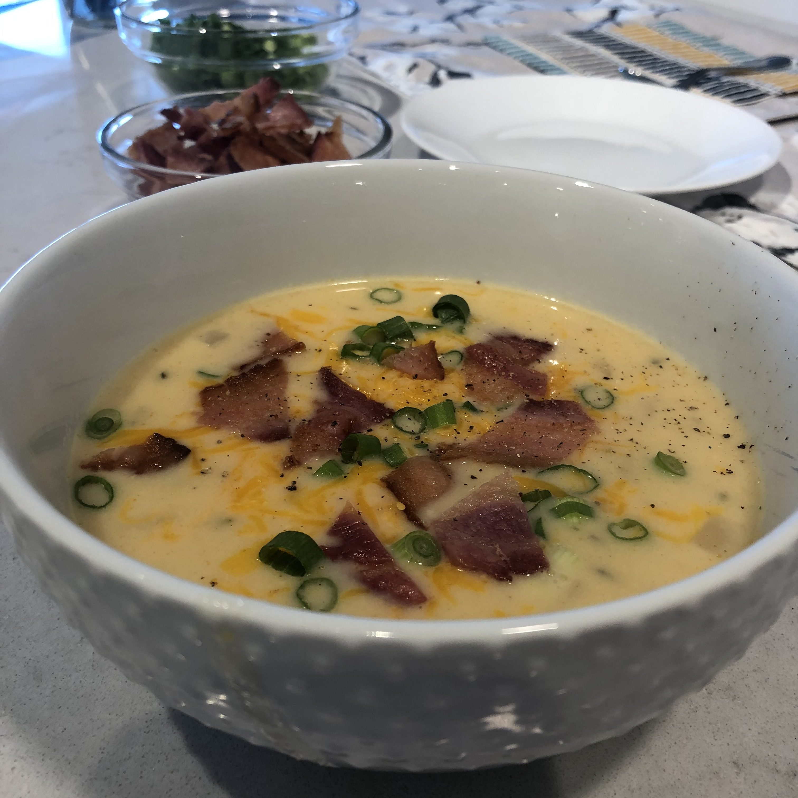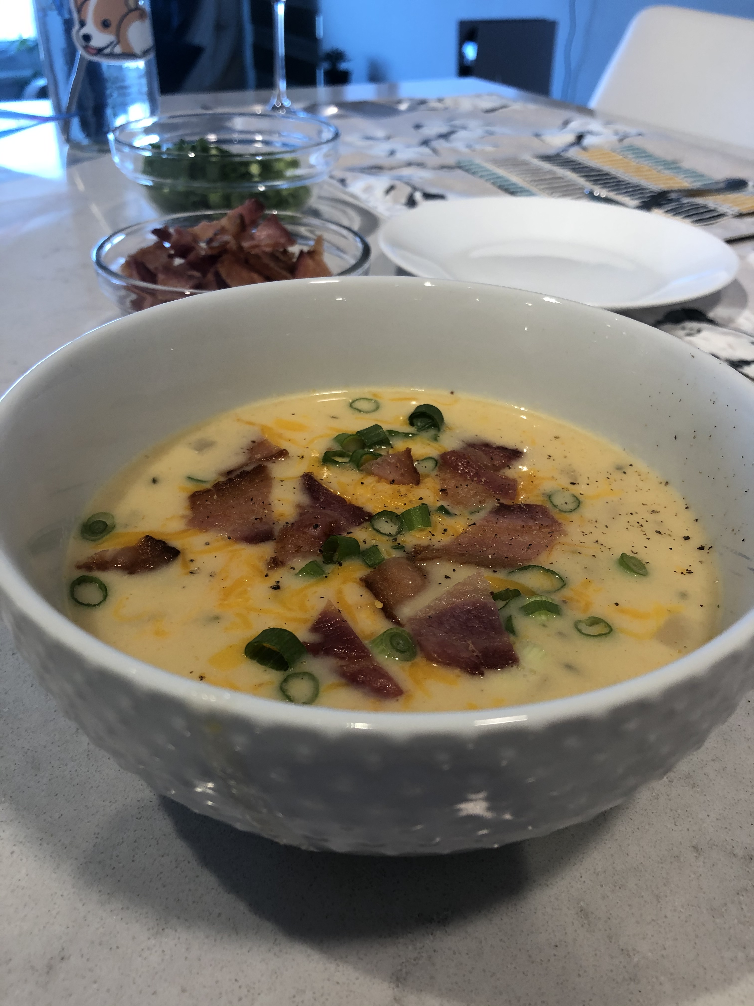 Using a ladle and blender, transfer about 3 cups of the soup and blend well. Re-add to the main soup pot and slowly stir in the heavy cream, bringing back up to a boil until thickened and creamy. Season once more to taste and serve hot!! & garnished with cheddar cheese, fresh green onions, and that crispy bacon.