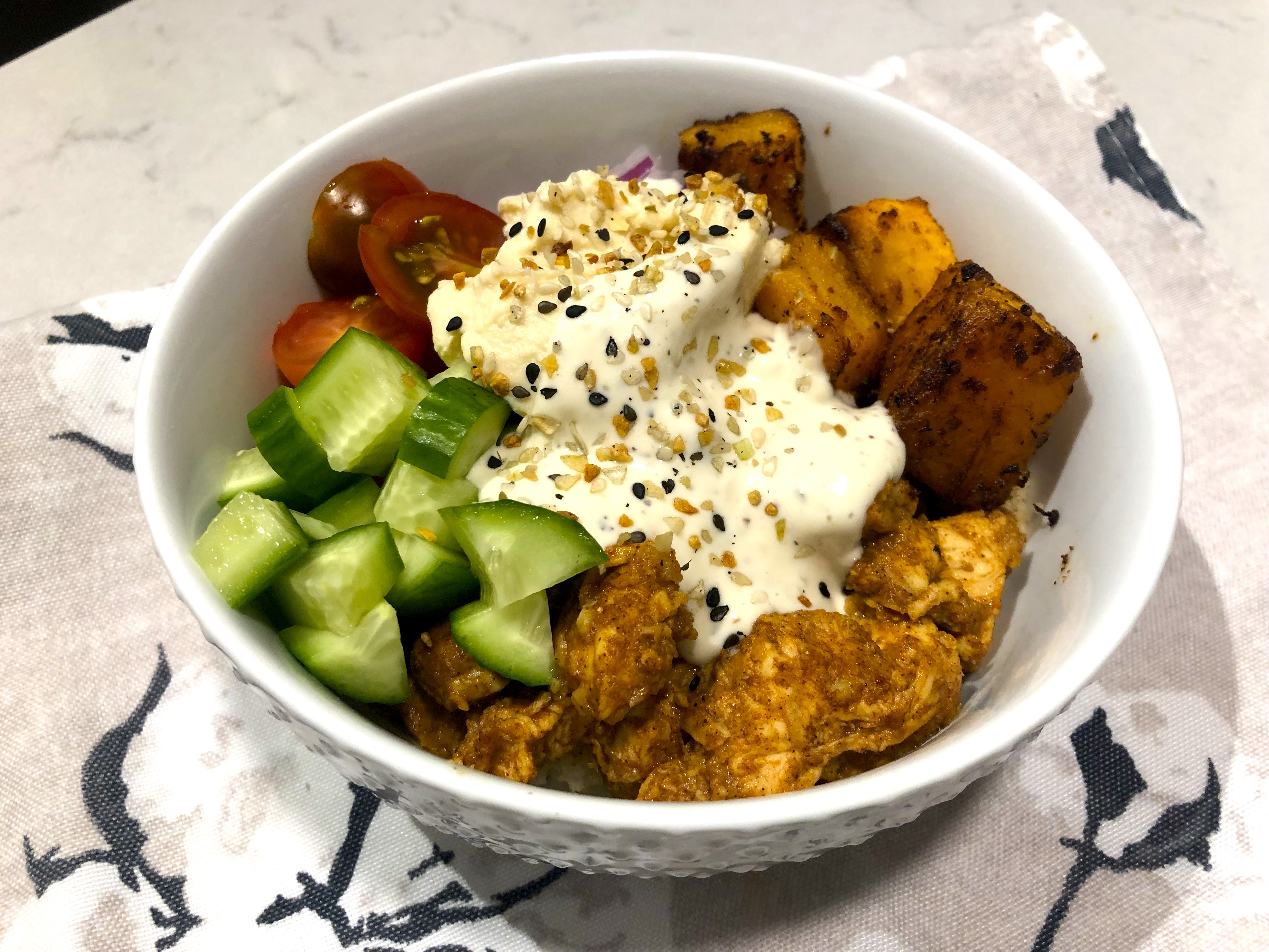 Now technically, I can’t call this a buddha bowl because apparently that is a term that normally refers to vegetarian or vegan bowl–but that is not the case for me here even though it’s riffing off the same concept of a protein/veg/grain situation in one cohesive bowl. Although I really love the idea of a Mexican inspired grain bowl (Chipoootlaaaay), I really wanted to bump up the fall ~VibES~ since we are at the peak of the season right now. To do that, I incorporated warm spices in my marinade, used a unique grain to save some time, and added everybody’s favourite fall vegetable; the almighty butternut squash.