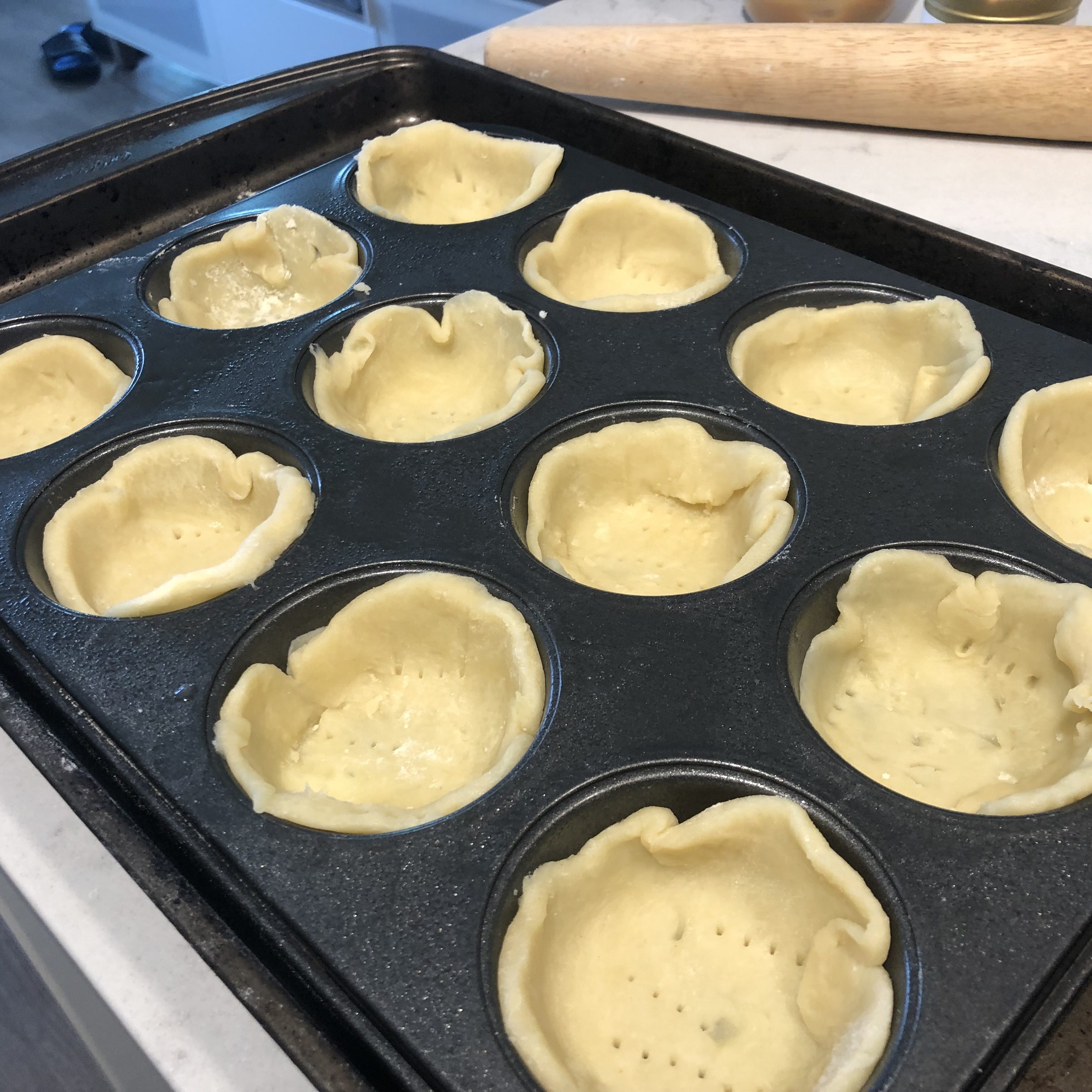 Spray your muffin tin lightly with cooking spray, and with each round, place the crust in the centre and gently mold it to the muffin tin, being sure to raise the sides along the tin. Chill in the fridge for about 20 minutes (to help re-harden the butter). Prick with a fork to stop the crust from puffing too much.