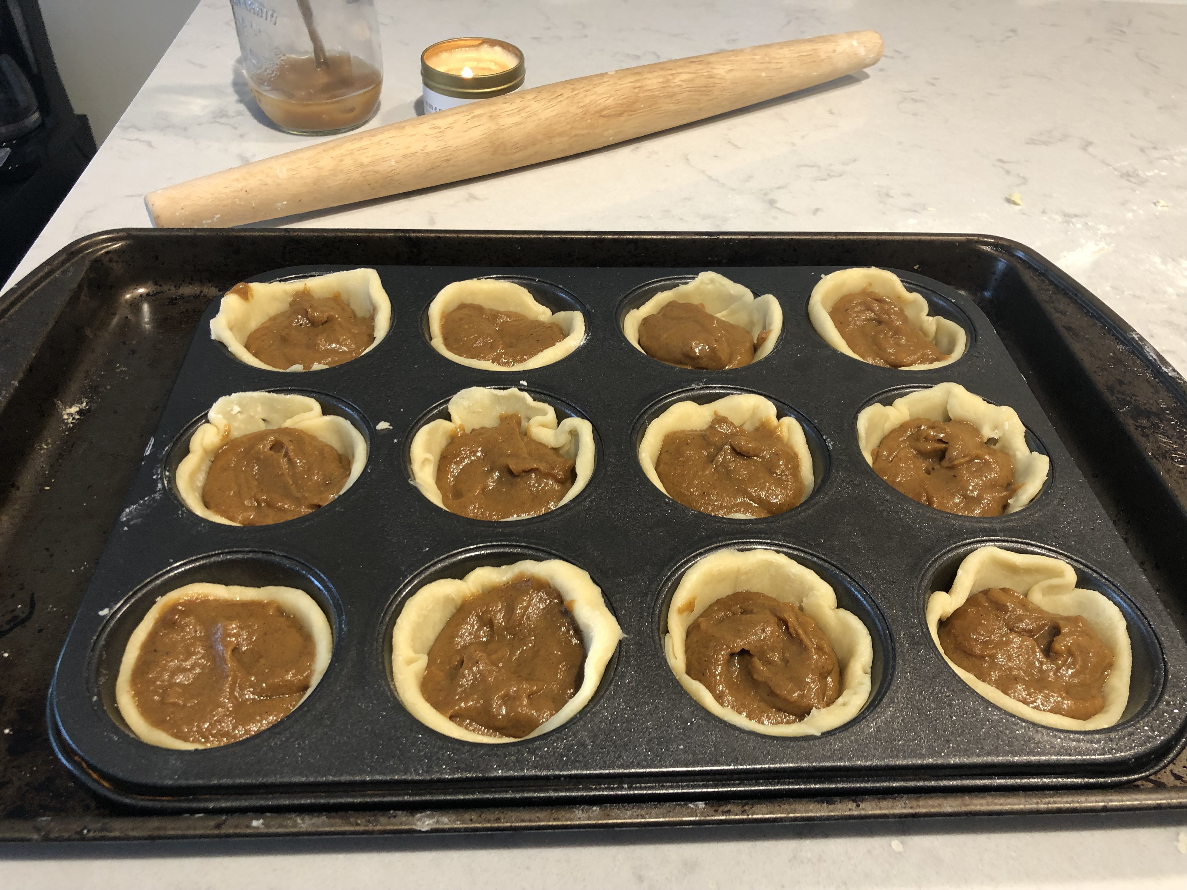 If you’re like me and don’t have a cookie cutter that will create large enough circles as your muffin tin + a little extra around the sides, then opt for a glass with a wide opening. Be sure to flour the edges as well before cutting out 12 rounds.
