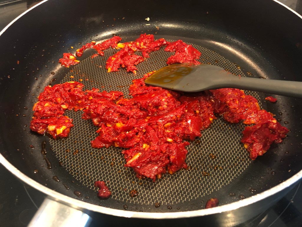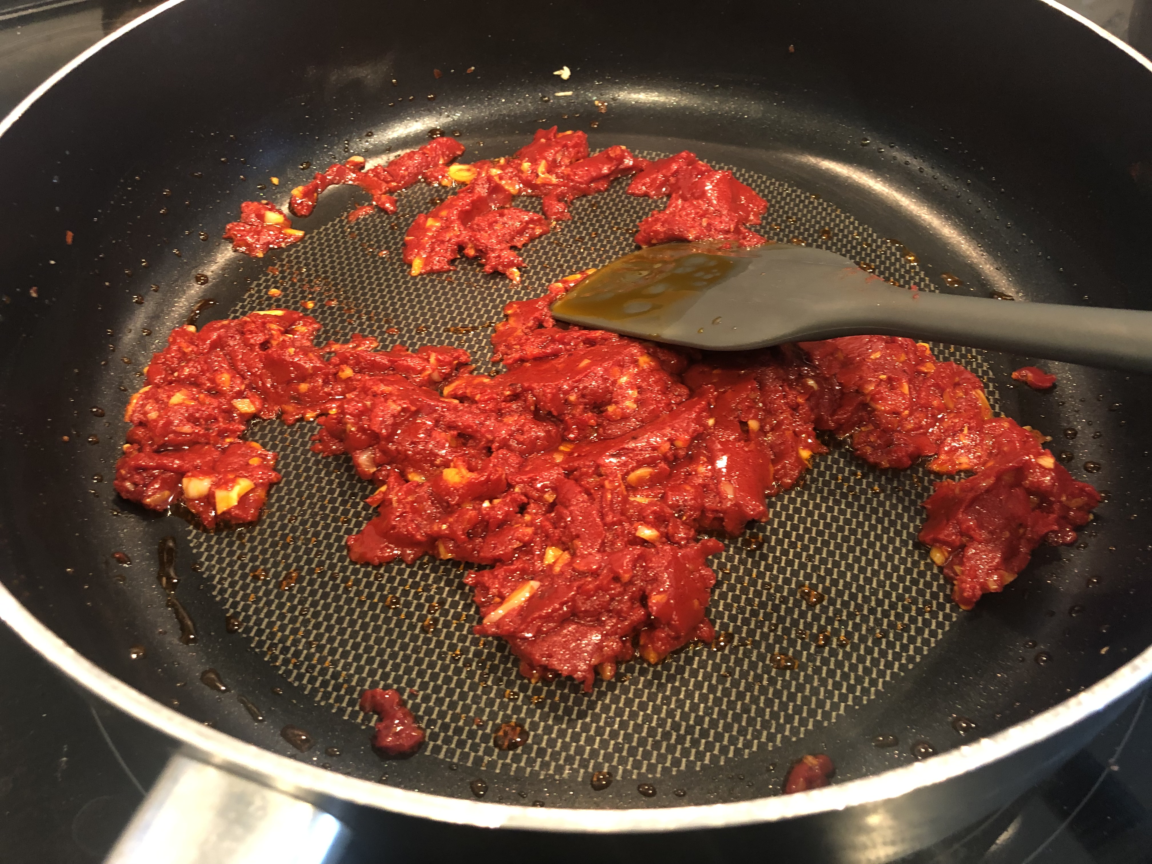 So why are we using tomato paste in this recipe as opposed to another tomato product? 1. it’s going to create a beautiful ruby red sauce 2. tomato paste is obviously more concentrated and is able to create that instant flavour bomb that normally would take a few hours to achieve if using a more fluid-tomato product, such as strained tomatoes.