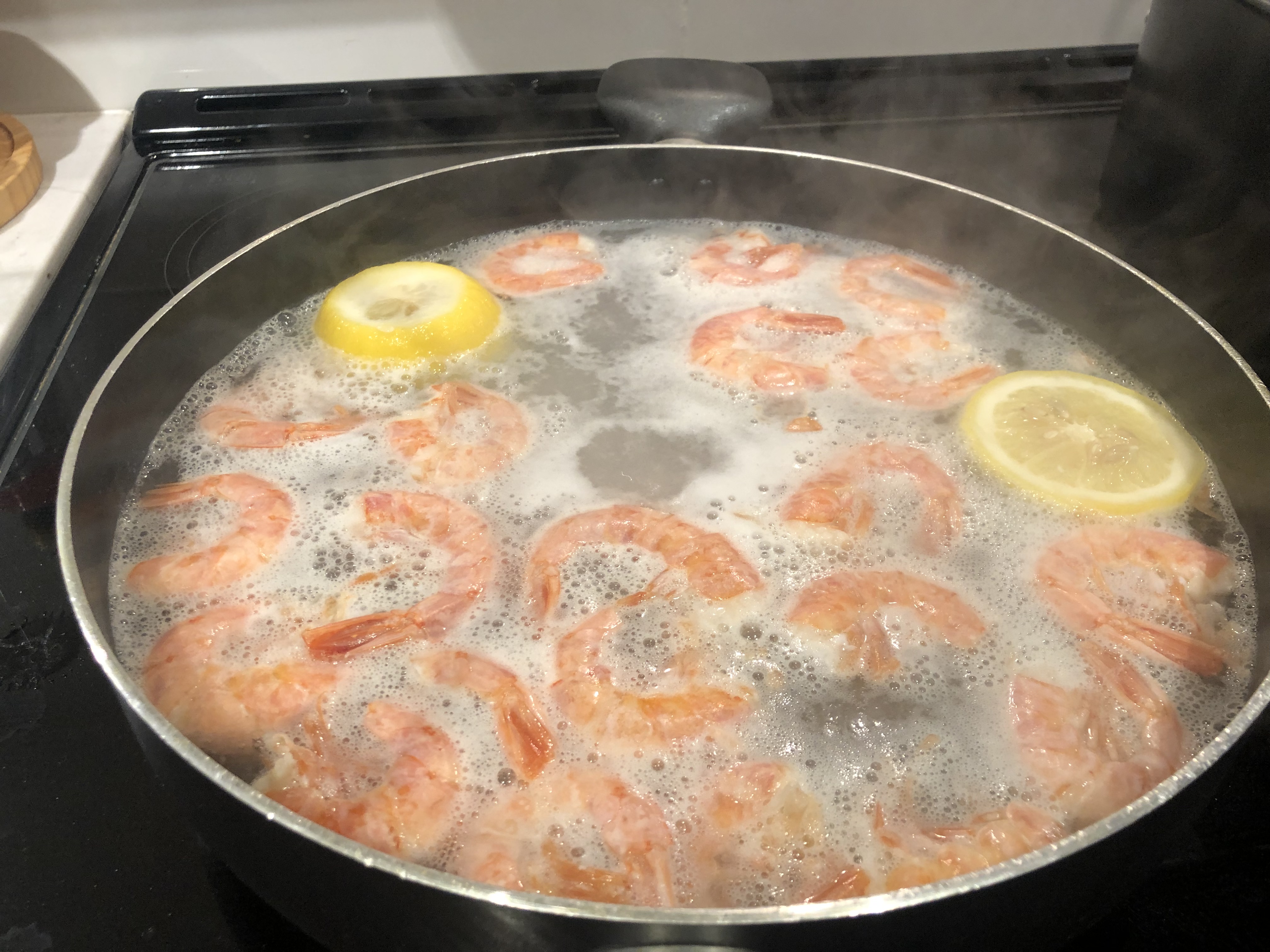In a large pan, add 8 cups of water, the kosher salt, sugar, lemon juice and lemon halves and bring to a rolling simmer. This is essentially your poaching bath for the shrimps — it’s purpose is to enhance the flavour of the liquid with equal parts of salt and sugar. The addition of citrus helps cook the protein evenly and keeps the shrimp from getting too mushy.