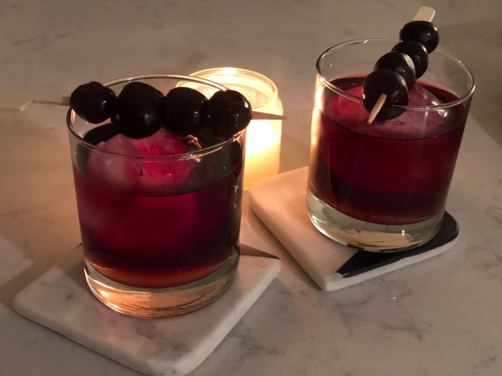 Soooooo, this may be my new favourite cocktail. I can picture myself sipping this on Christmas Eve night, listening to some jazzy carols and with the fireplace lighting up the room with a cozy glow. I love that this cocktail includes red wine and a very winter appropriate fruit — the almighty dark cherry. It tastes smooth, citrusy, and very well-rounded because of the way the wine plays with the cherries.