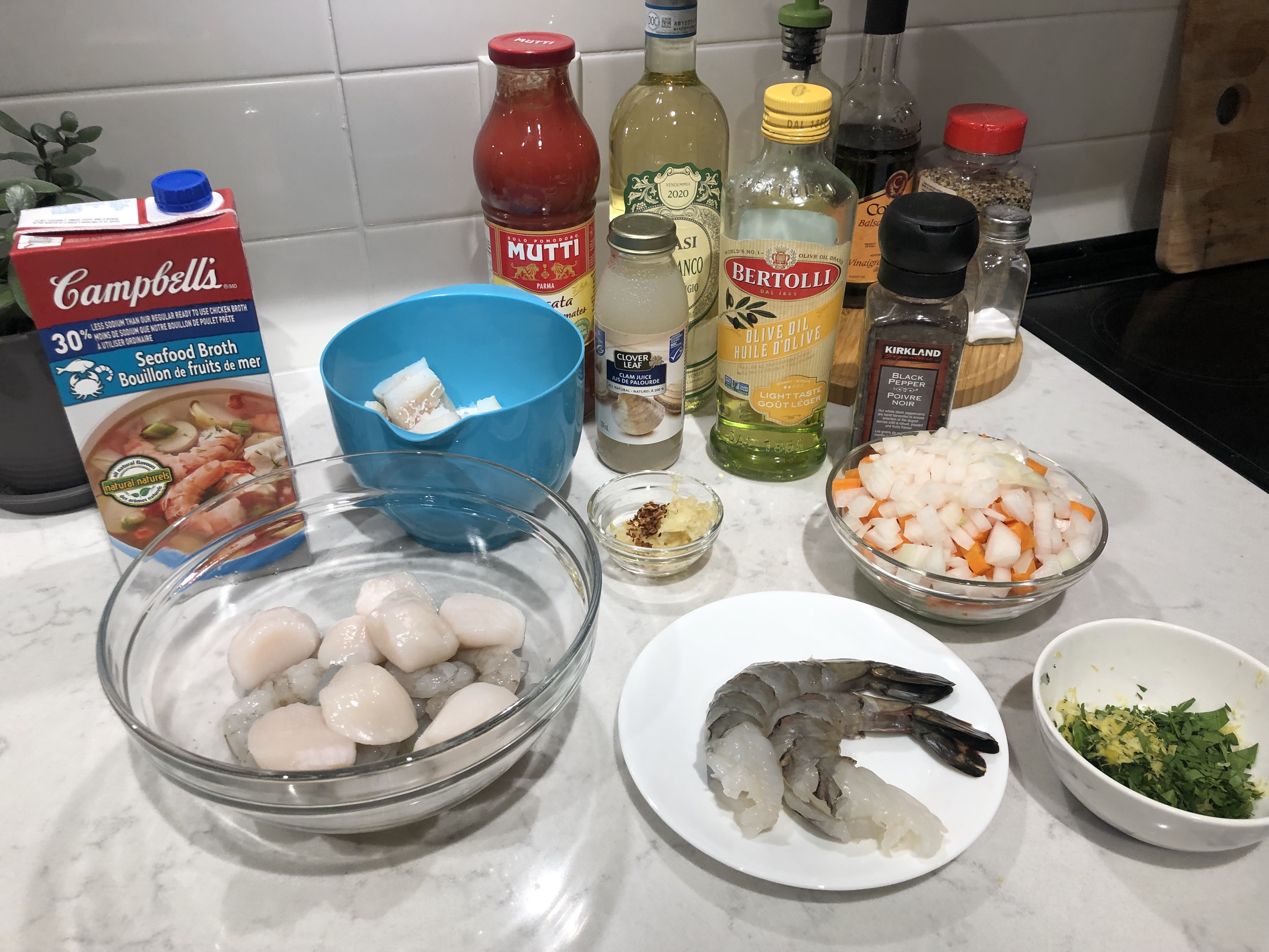 This one is for all my seafood lover’s out there. A relatively quick stew that can be made within an hour, that doesn’t break the bank, but definitely makes you feel like you’re dining under some twinkly lights in San Francisco at night. The nice thing is that you can really substitute any type of seafood that you fancy — for this one I chose ingredients that I knew my “new to seafood” boyfriend would enjoy, which included scallops, shrimps (jumbo + small) and codfish. As a bonus, I share how to make garlic toast with gremolata as an extra accompaniment to your cioppino!