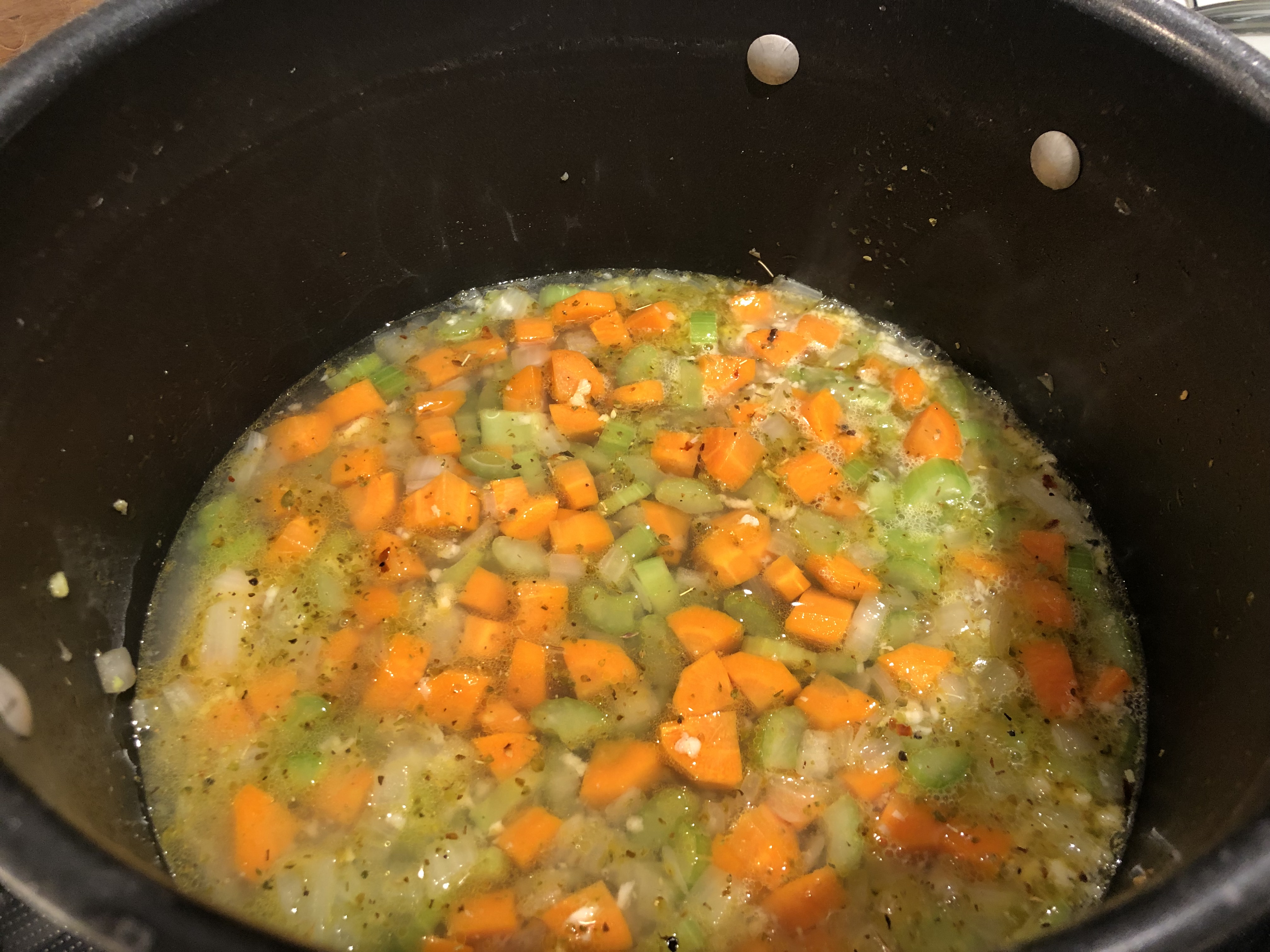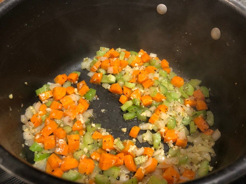 In a Dutch oven or large pot, add a tablespoon of olive oil and bring to medium heat. Add the onion, carrots, and celery and sauté for 5-6 minutes until softened, before adding the minced garlic (see note), oregano, and red chili flakes. Sauté for an additional minute until the garlic is fragrant. Next, add the white wine and deglaze your pot – simmering until the wine has reduced by about half.