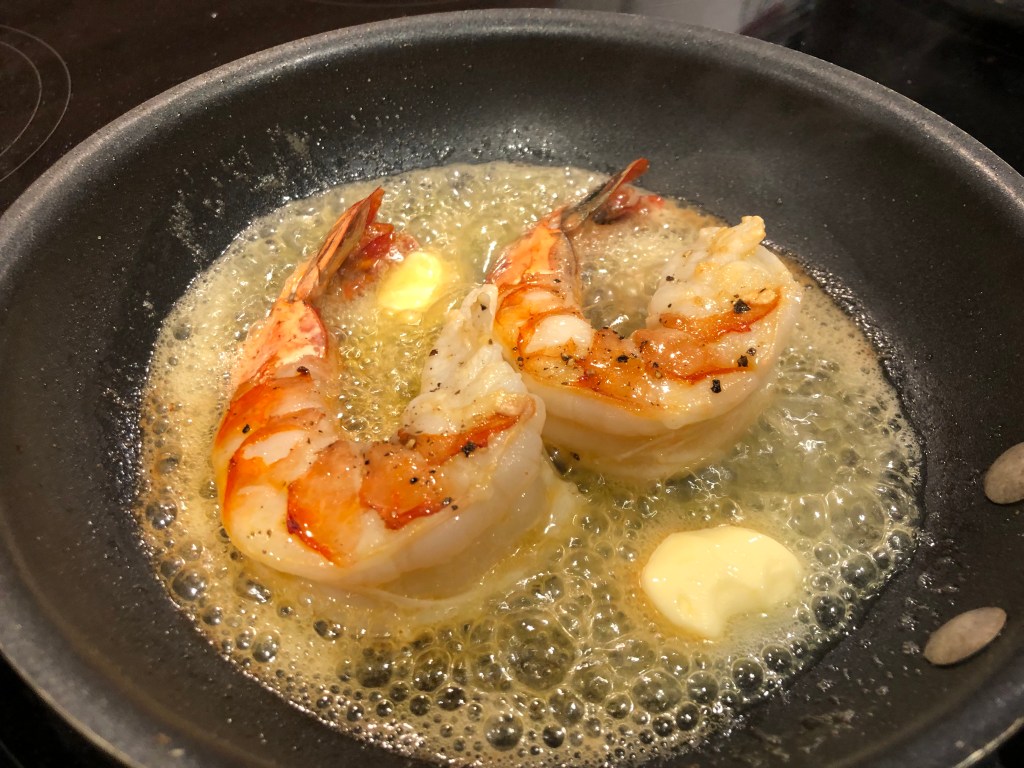 While your seafood is cooking , season your jumbo shrimp with salt and pepper on both sides. Sear quickly in the pan for only a minute or two per side. Lower the heat all the way and then throw in a few tbsp of the unsalted butter in the pan, to create a quick brown butter situation. Then…baste those babies.