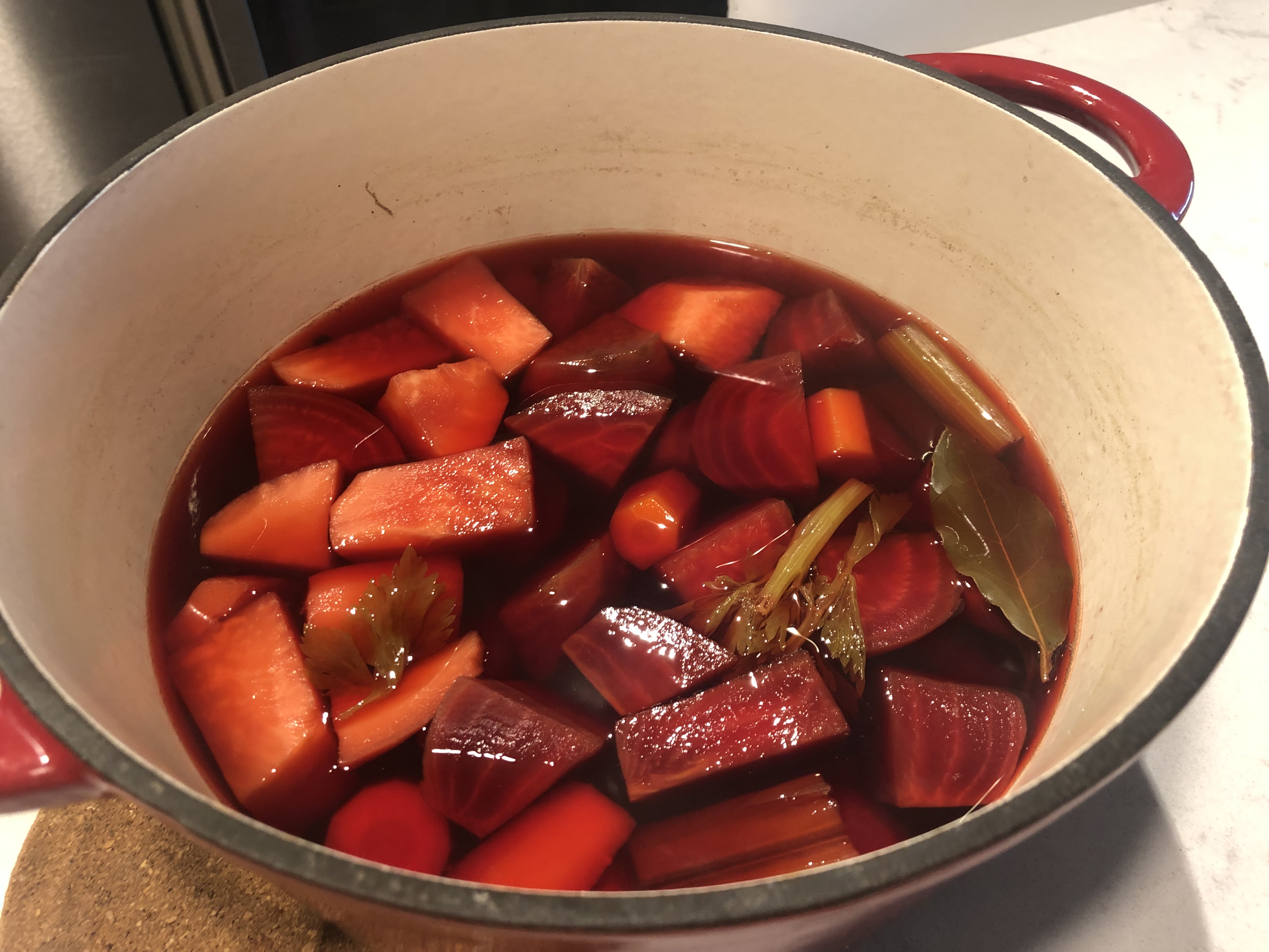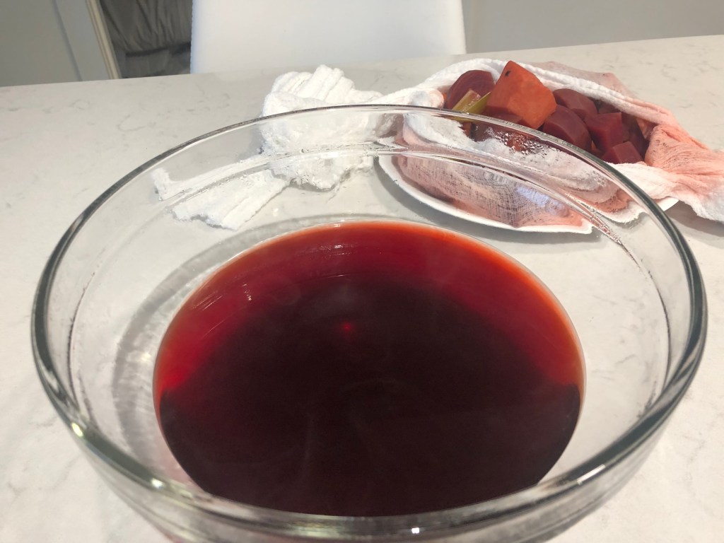 The goal here is not really worry about cooking the vegetables too far as much as it is to extract all the flavour they can give. Beets are naturally earthy in flavour, and the addition of parsnip and carrot will bring a sweetness to the end result in the broth. So in this case, it is completely alright to have very mushy vegetables as they won’t actually be part of the final soup.