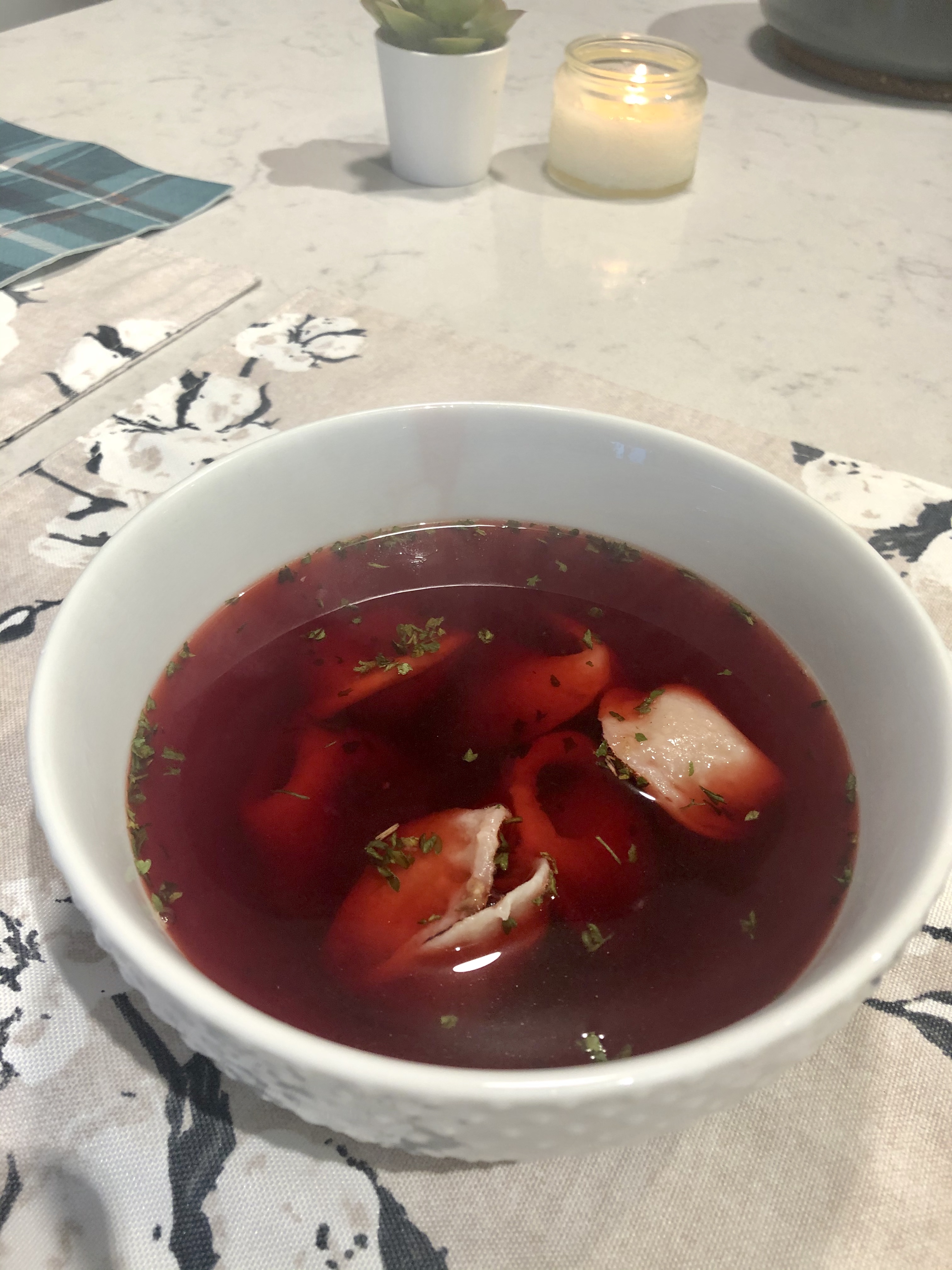 Before you’re ready to serve, go ahead and drop your uszka into some boiling water and cook according to package instructions. When they are ready, serve at least 5 in a nice big soup bowl along with the broth. If you ask any person on my mom’s side of the family, this soup is best served hot as LAVA.