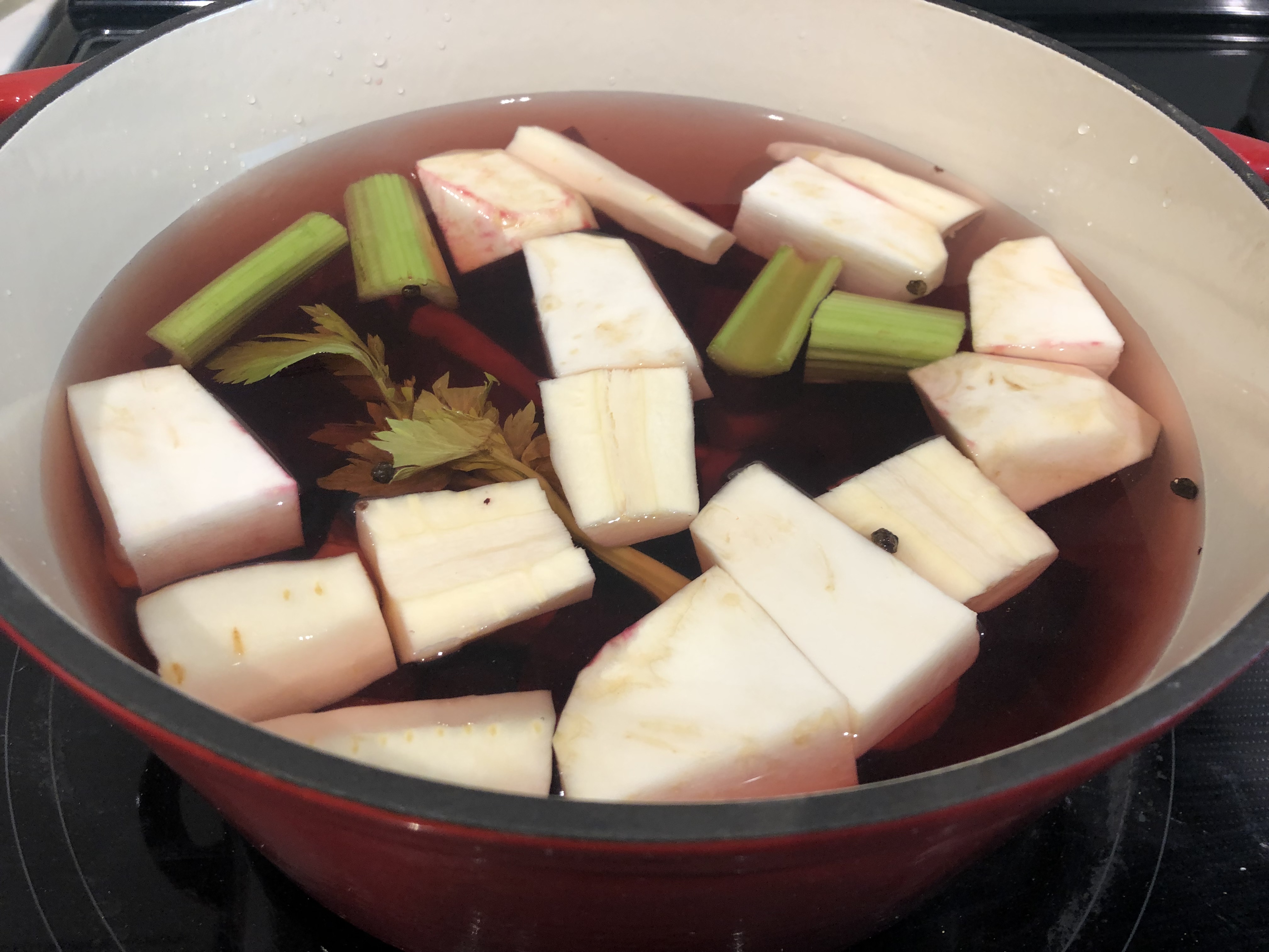 Next, place the beets, parsnip, celery, celery root, and carrot into a large pot or dutch oven. Add the water and mushroom broth you just created for added depth, plus the bay leaves and peppercorns. Turn on medium heat and allow to simmer, before covering with a lid and cooking for about 1.5 hours, stirring every 20 minutes or so.