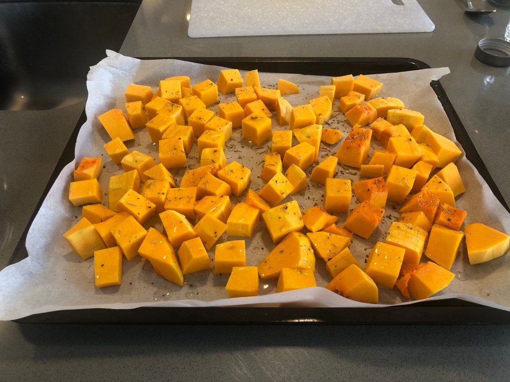 Start by preheating your oven to 400°F. Spread your squash out evenly on a baking tray and drizzle with olive oil, salt, pepper and some dried rosemary if you have. Roast for 30-35 minutes or until the squash is tender and a fork can go through it easily. Set aside to cool once finished.
