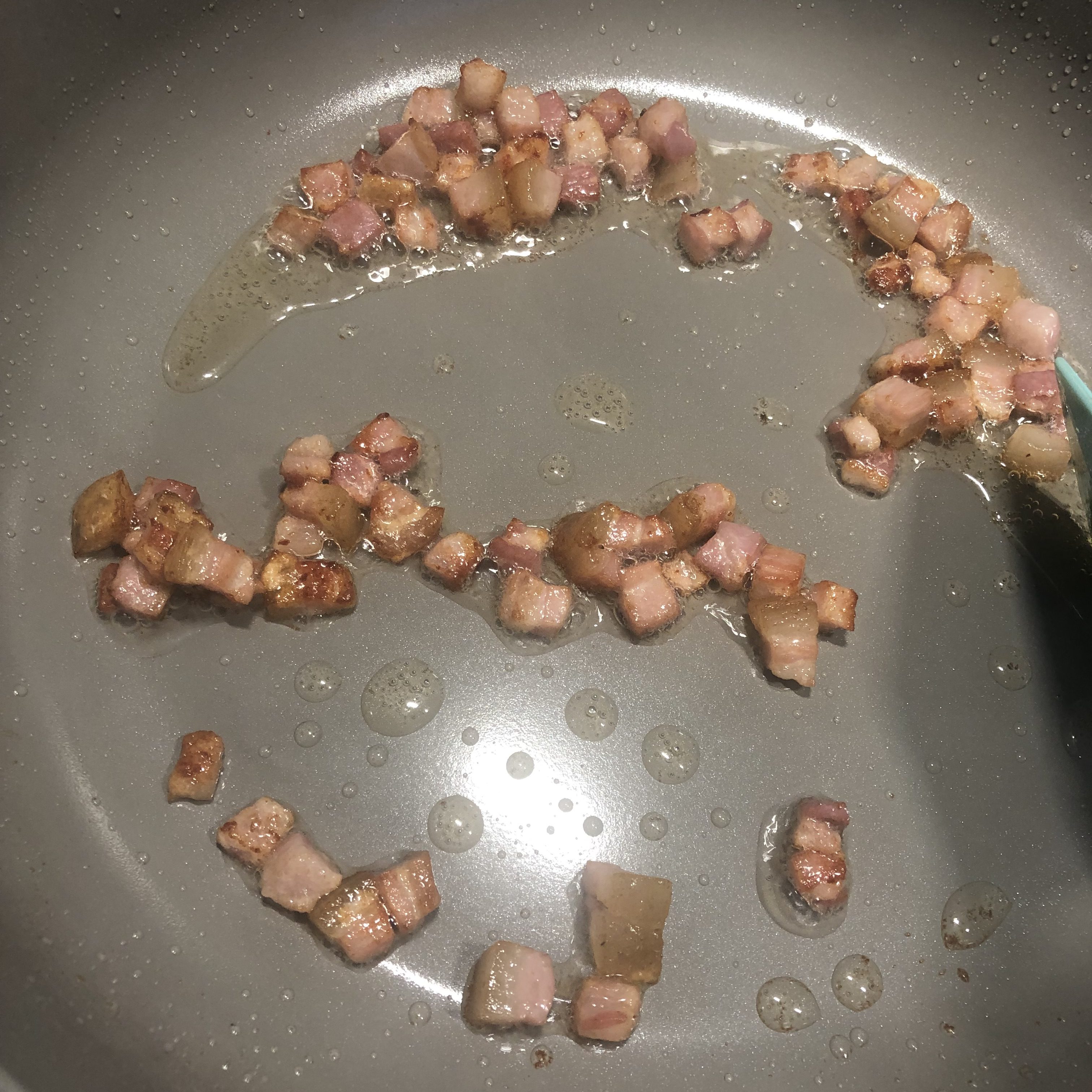 During this time, put a small pan on medium heat and add your pancetta to the pan. No additional oil is needed as there’s plenty of fat within the pancetta. Watch the pancetta as it won’t take long to render and cook to a perfect golden brown colour. Once cooked to your desired crispiness – remove with a slotted spoon to separate from the oil and set aside to cool. They will most likely darken as they cool and get crunchier.