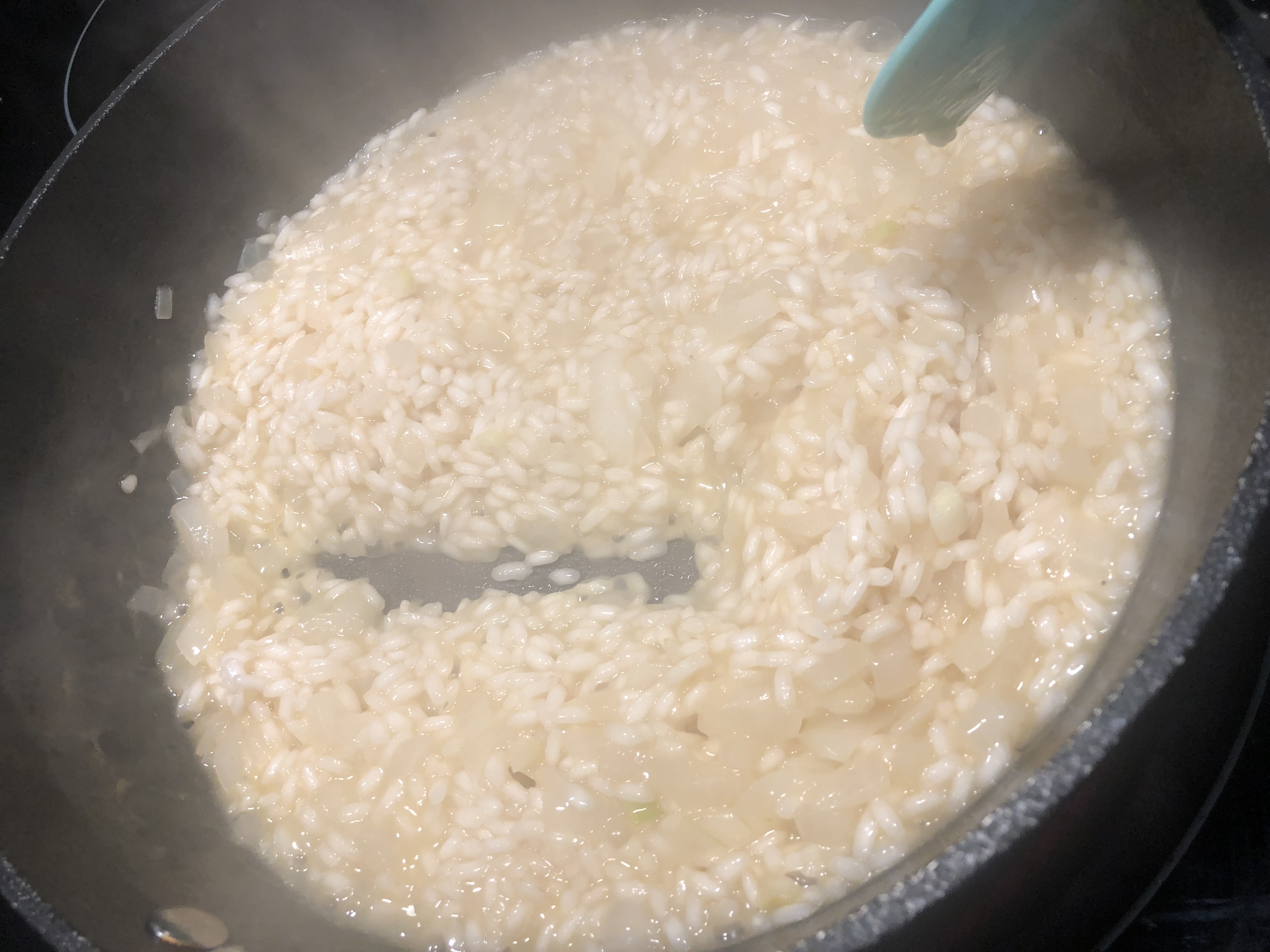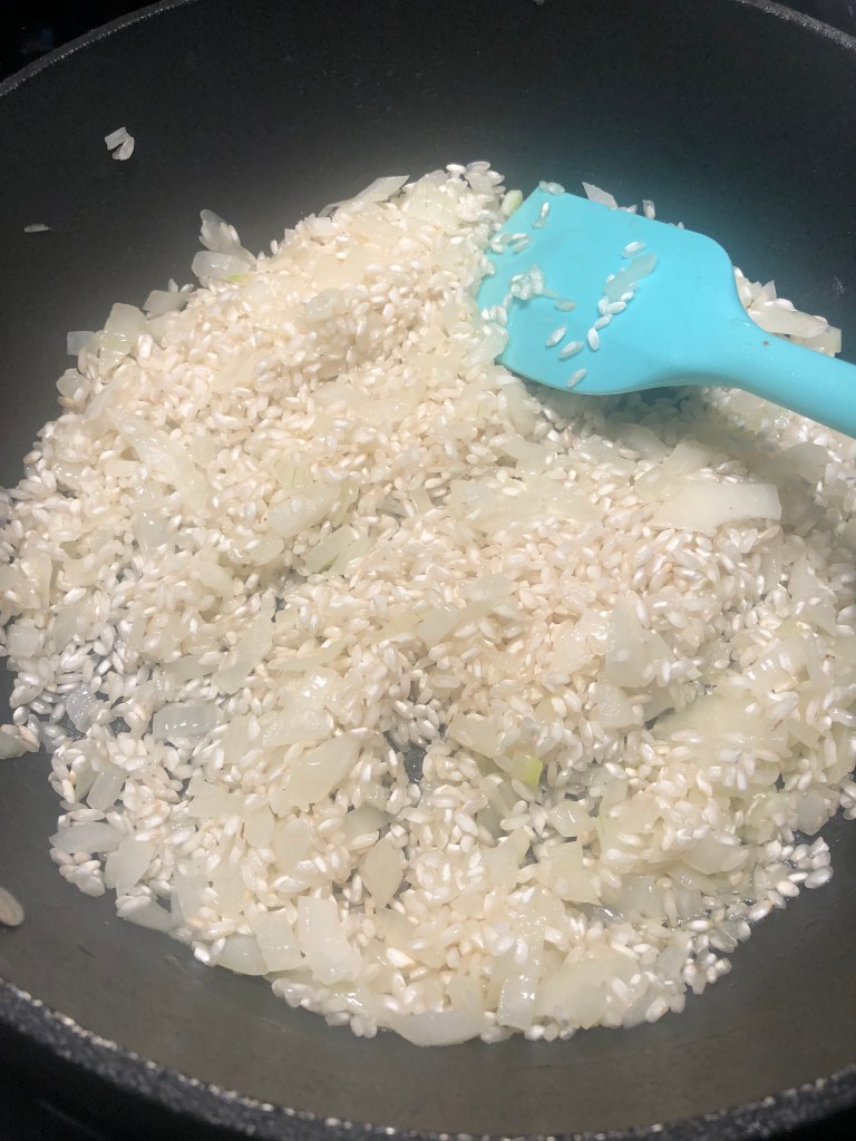 In a large pan, heat about 2tbsp of olive oil over medium heat. Add the diced onion and cook until translucent and soft. Try not to let them take on too much colour or get too crispy. At the same time, place a medium sauce pot on your back burner and let your broth come to a warm temperature. This can stay on a low heat for the duration of your cooking — you will need it for the risotto!