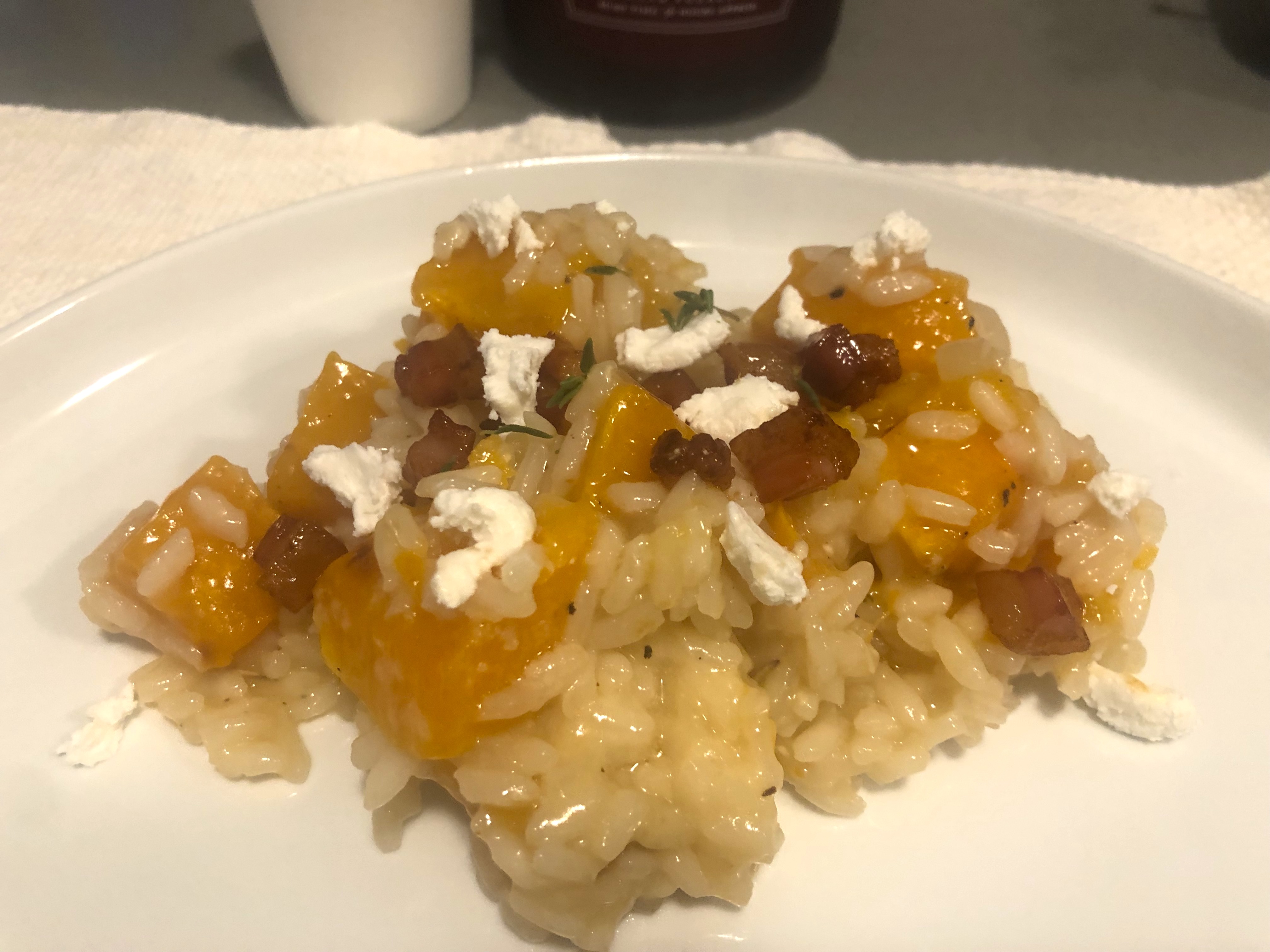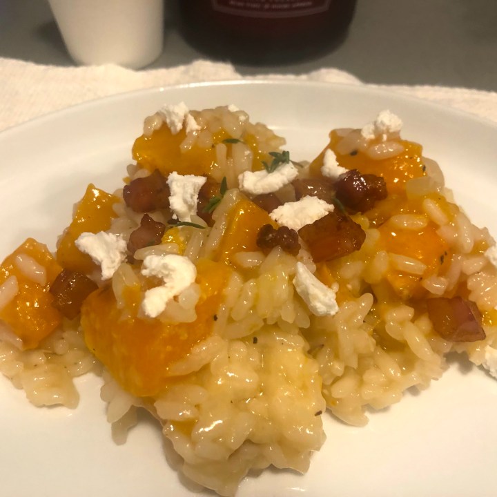 This butternut squash risotto is paired with creamy goat cheese on top that helps break through the richness of these salty, crispy, and rich pancetta nuggets as garnish.