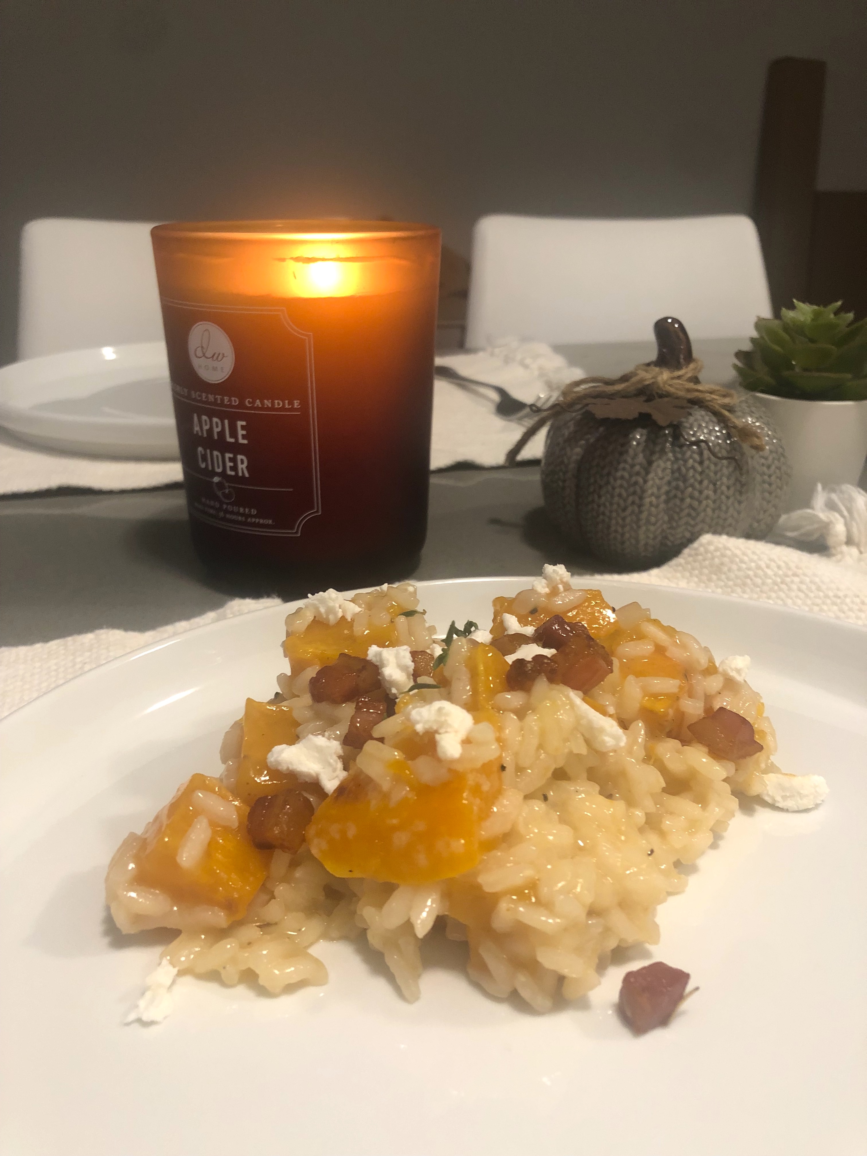 I’m sure I’ve said about 1000 times already that nothing screams comfort food quite like the start of autumn … but when that slight chill in the evenings starts, you better believe I am running over every recipe I can think of trying to cram them into my agenda for the next few months. Risotto is also one of my favourite things to cook! It’s a patient process and gets even better when you set the mood for a night of cooking — glass of wine to sip on while you work, jazzy music in the background, and a new candle lit for that cozy glow.
