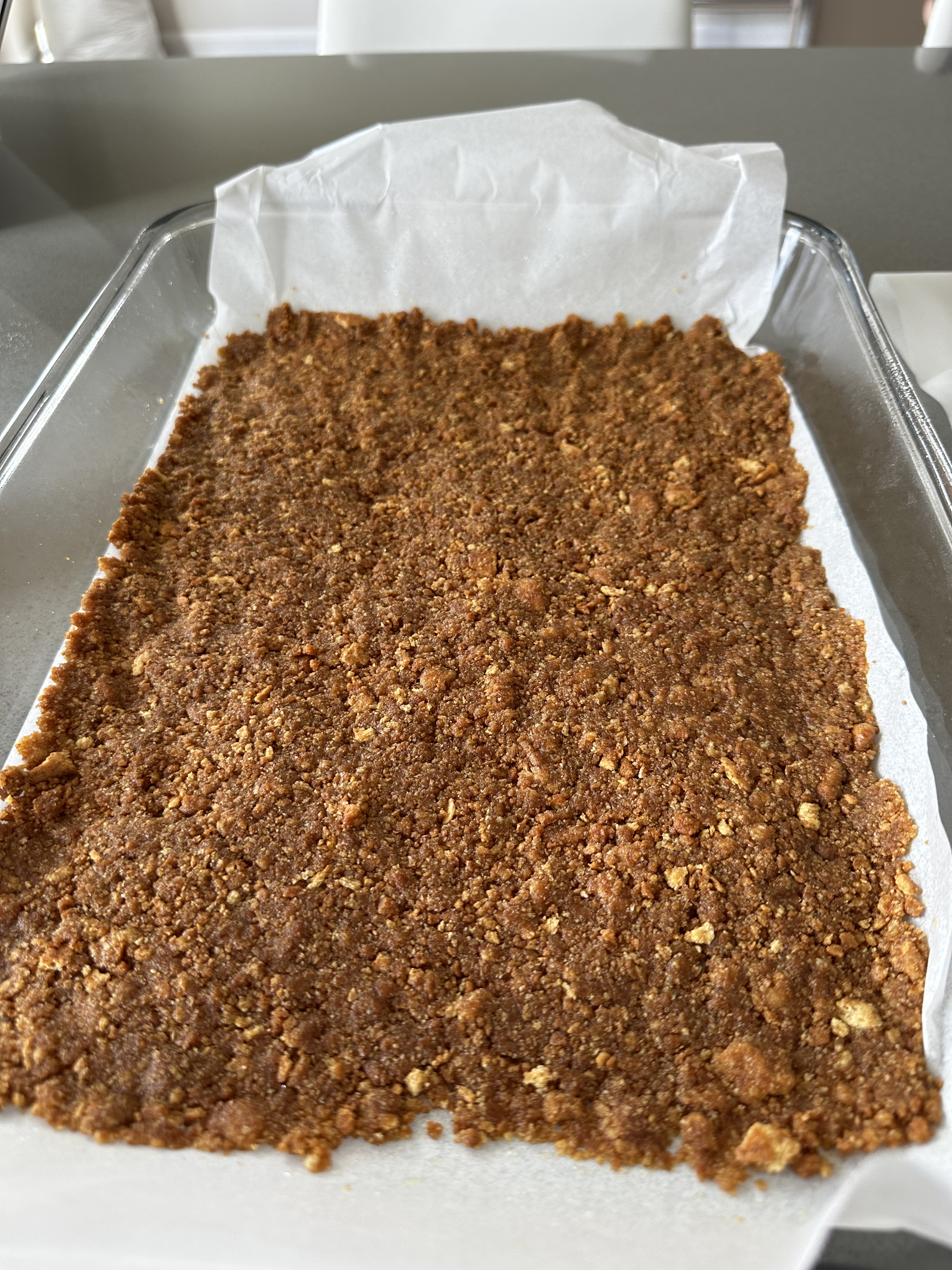 I don’t actually have a large food processor, so I opted to take the graham crackers I had and place them inside a giant Ziploc bag. Next, I would place the bag between two kitchen towels, and using a rolling pin, bang out some frustration! Do the same with the Biscoff cookies and then add to a large bowl. Add the granulated sugar and melted butter and mix until combined until it looks like wet sand.