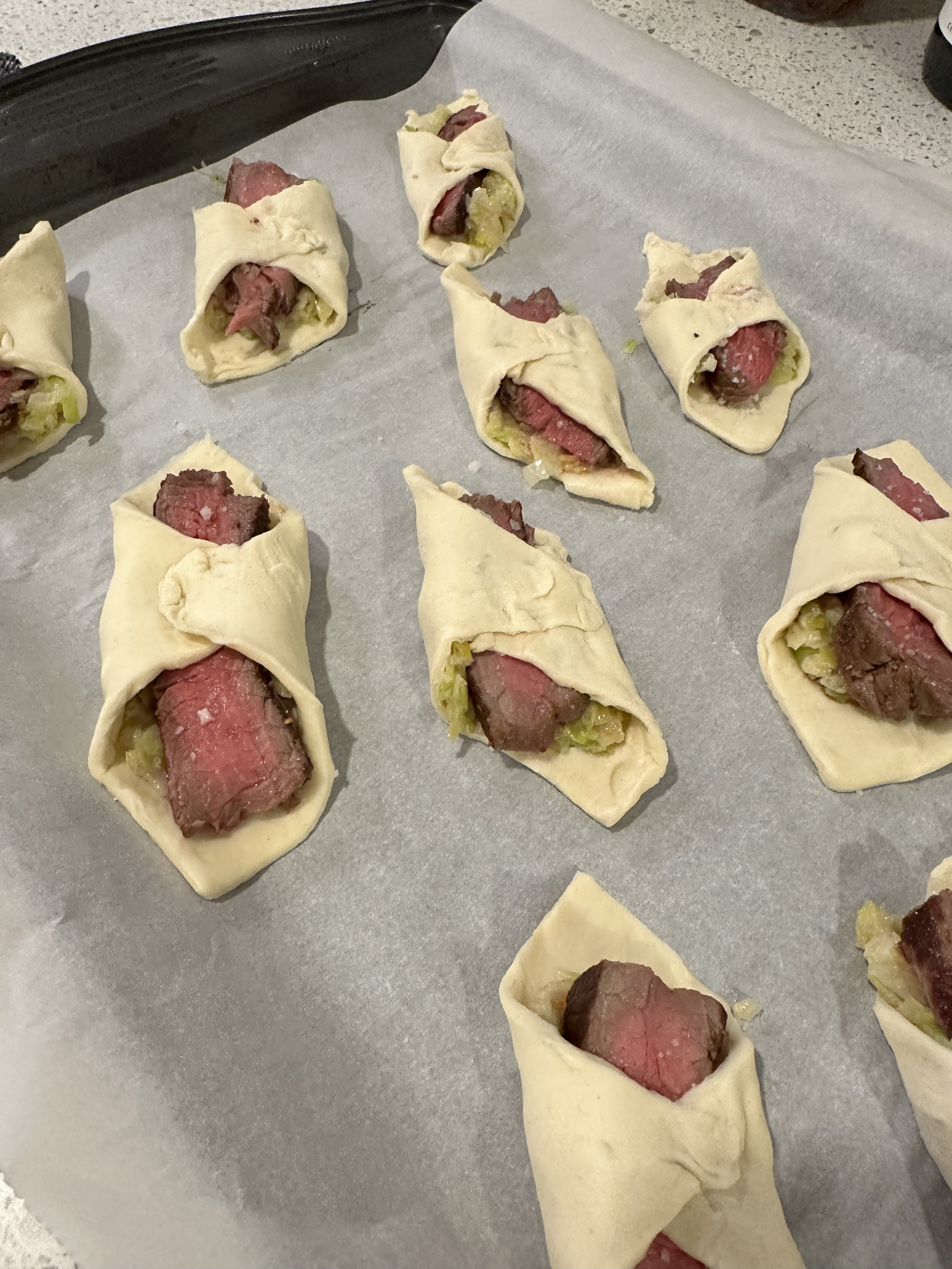 LG,BE Chef's note: Even if you are not a huge fan of medium rare steak normally, not to fear. Since the puffed pastry still needs to be cooked, you can cook the steak slightly more on the rare side since it will be in the oven for about 15-20 minutes and will surpass mid-rare inevitably. Don't worry, I promise it's still delicious and not dry whatsoever.