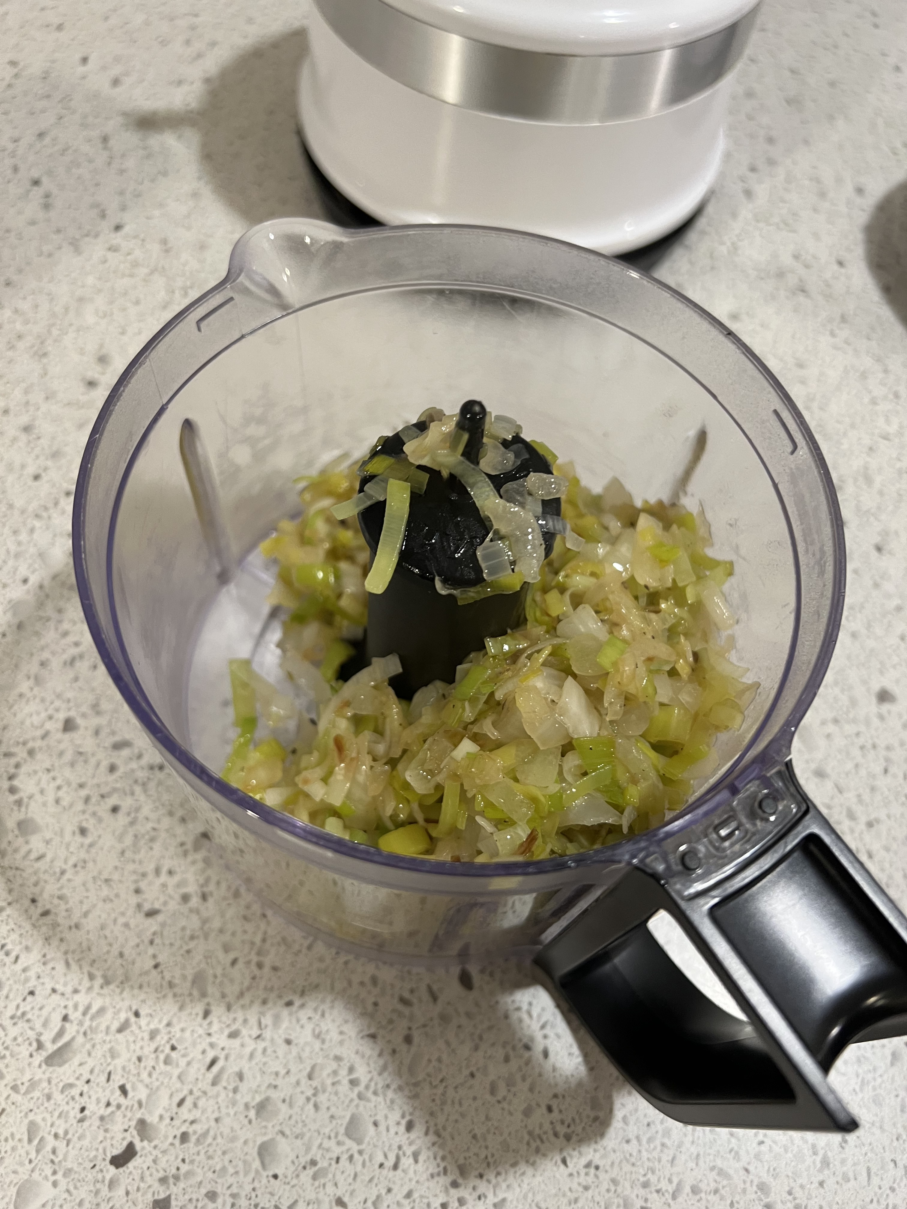 Next, add 2 tbsp of butter and a drizzle of oil to a pre-heated frying pan and sweat out the leeks and onions for about 6 minutes, until the vegetables are soft Season everything with salt and pepper and remove from the heat to cool for a moment. To a mini food processer, add the mixture and blitz for about a minute to create a bit of a minced paste of the onions and leeks. Alternatively, you can use a chef’s knife and finely mince the mixture until it gets to this consistency. Set aside for later.