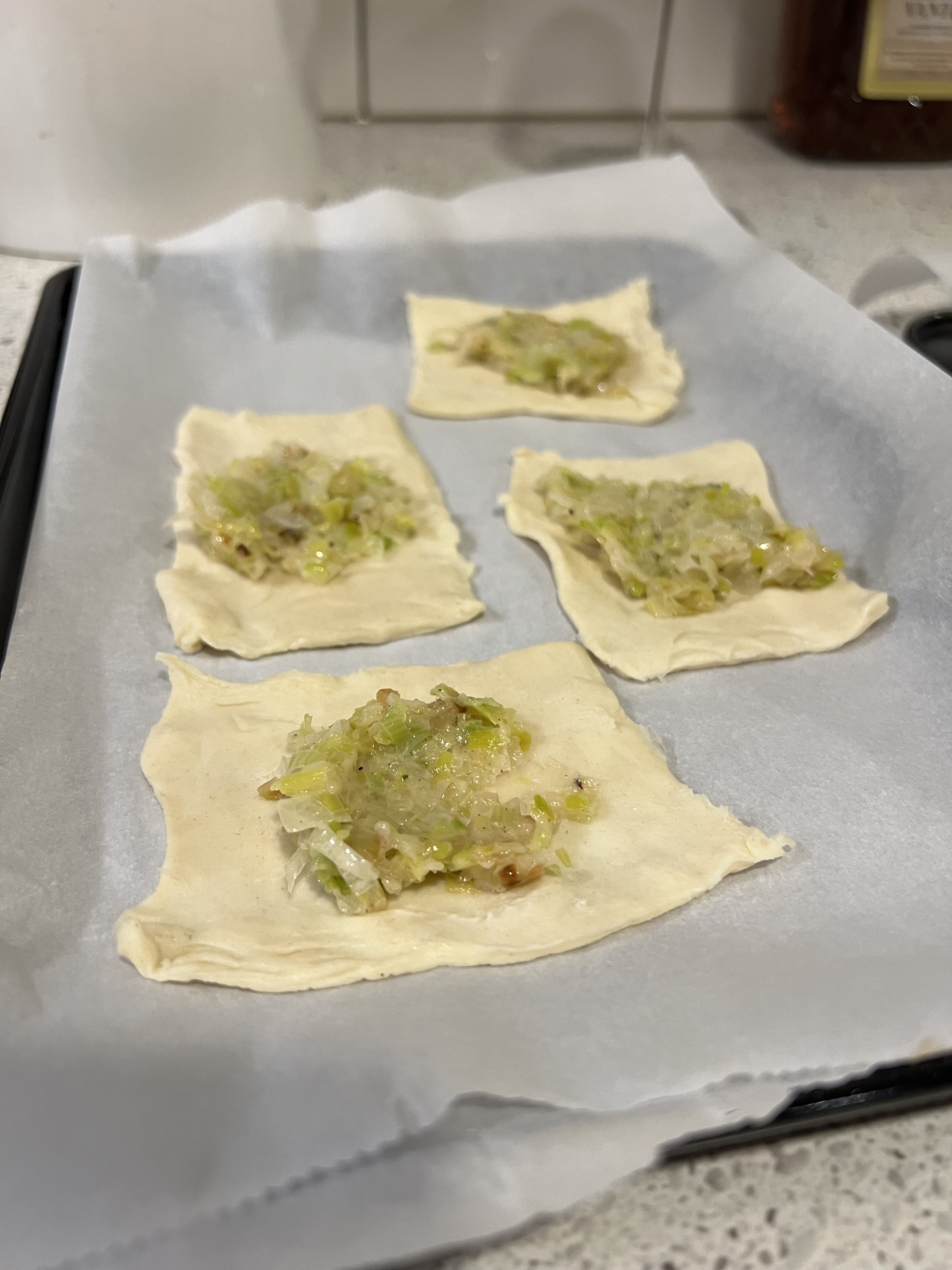 Remove the puff pastry from the fridge and roll it out on a lightly floured surface to about 1/4 inch thickness. Using a pairing knife, cut the dough into 9 even squares for each package. In the center of each square, place a dollop of the leek and onion mixture and spread it out with the back of a spoon.