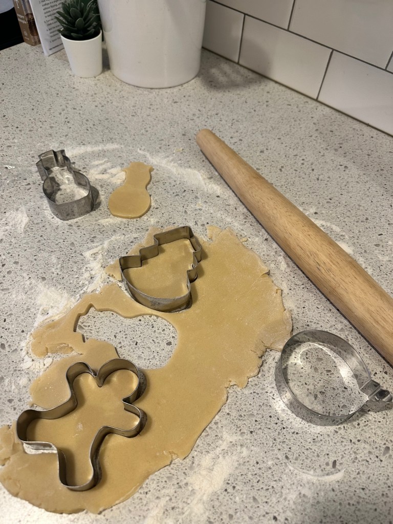 Preheat your oven to 375°F and line baking trays with parchment paper. Sprinkle some flour onto your working surface and roll out the dough to about a 1-4 inch thick. Next, use cookie cutters (preferably Christmas-themed shapes!) to cut out the dough and lay them on the baking trays.