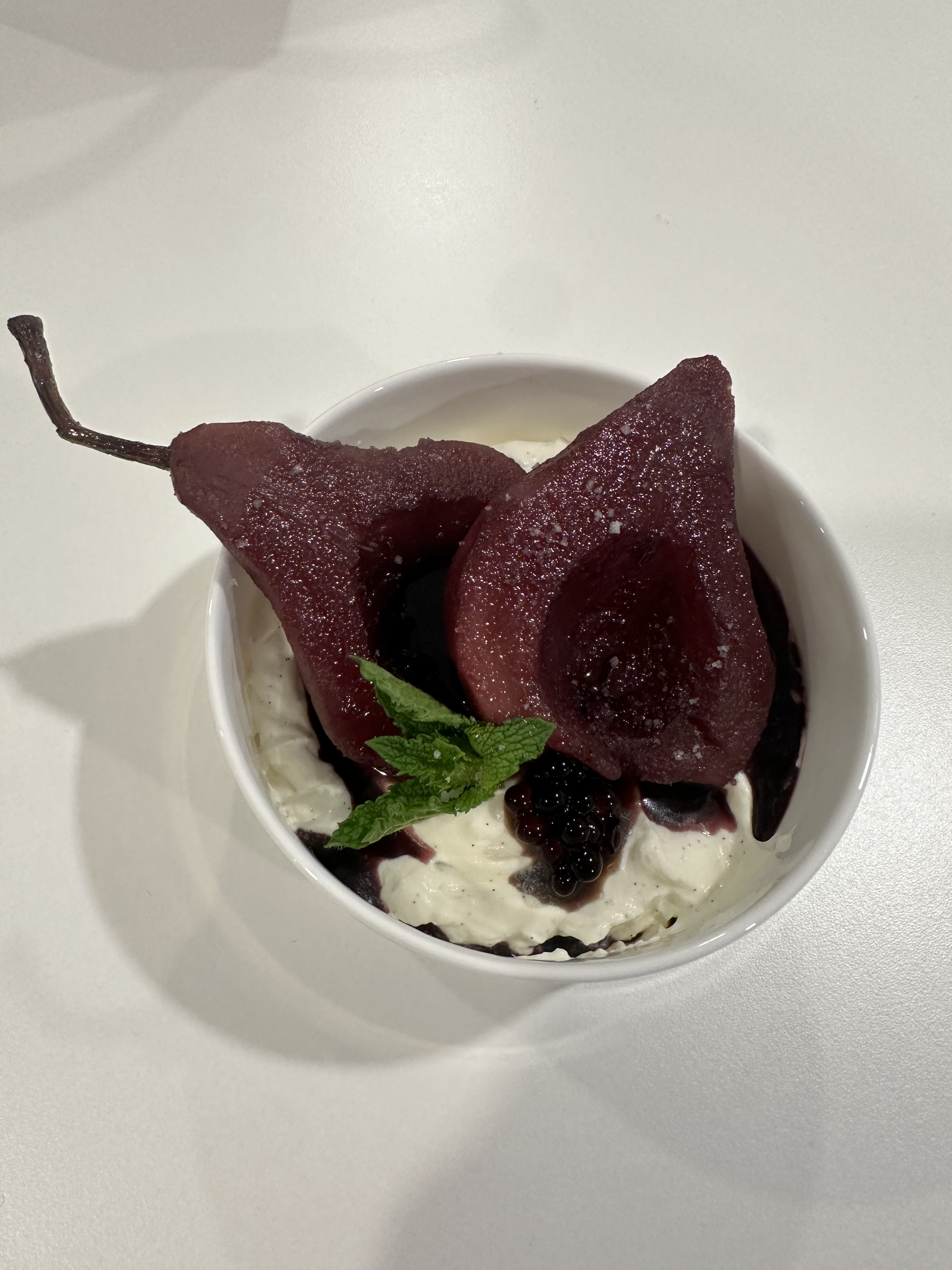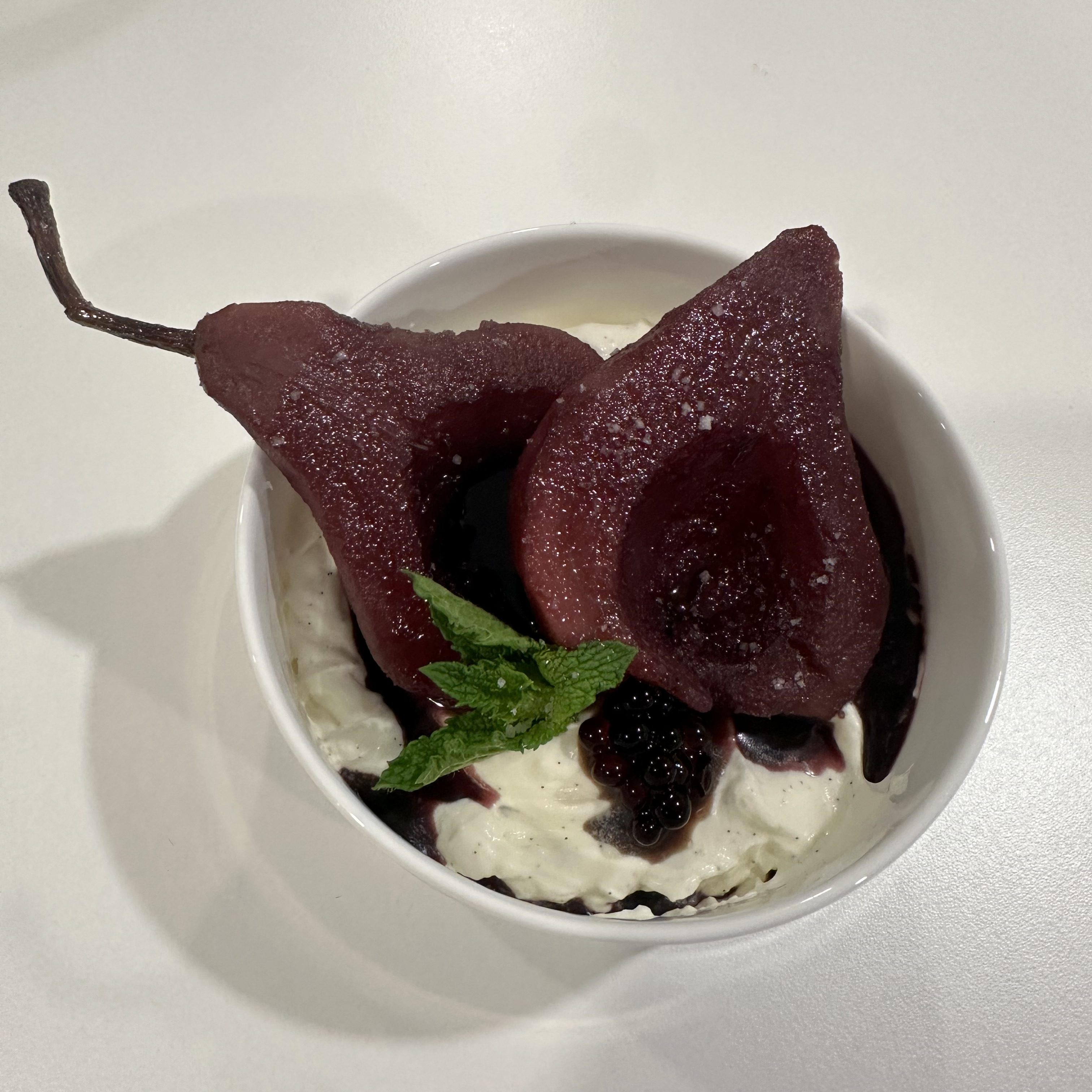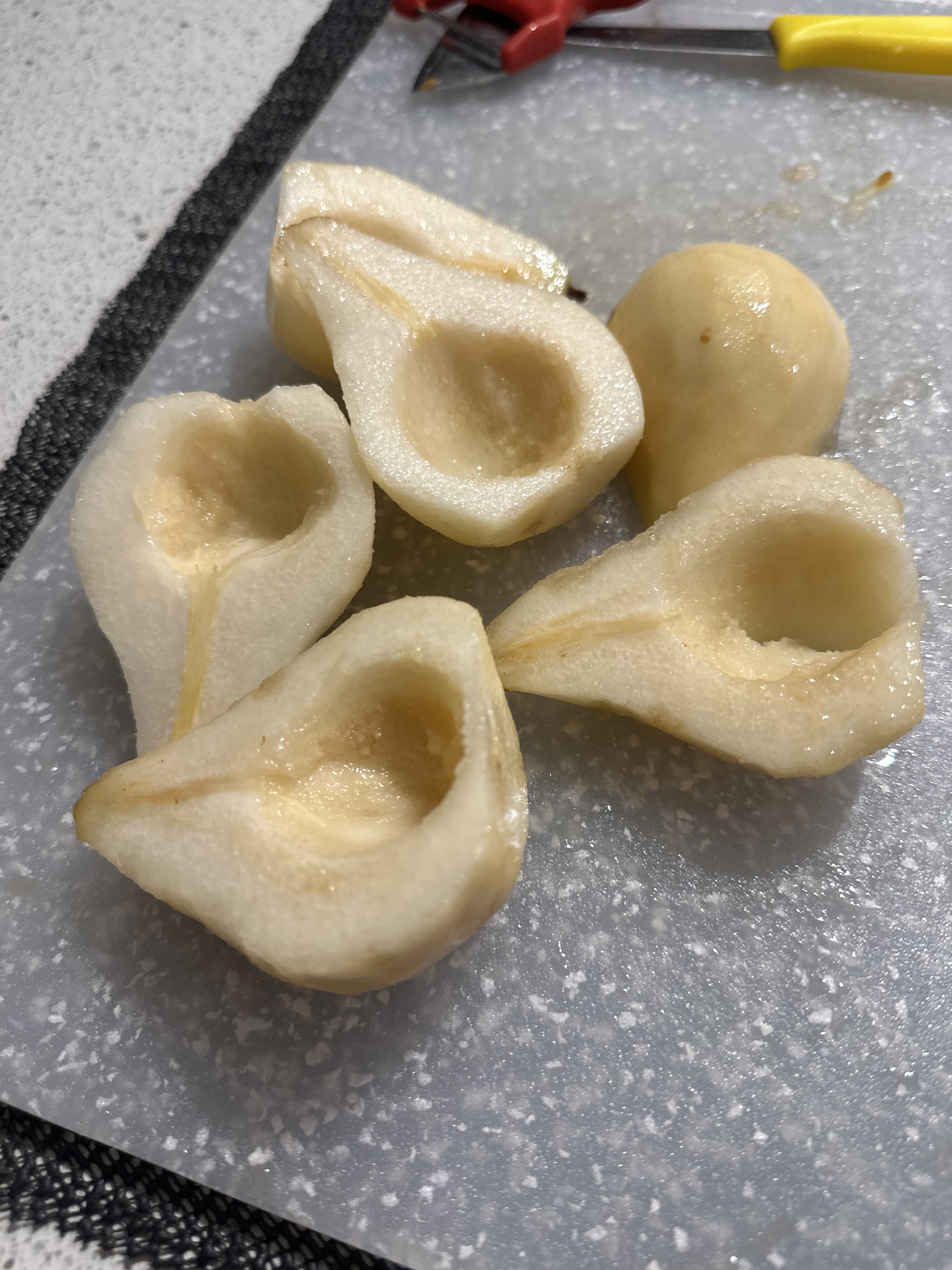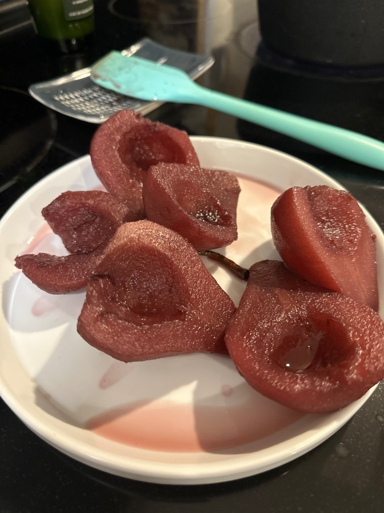 - 3 firm (but ripe) Bosc pears peeled and halved, insides scooped out but stems in tact